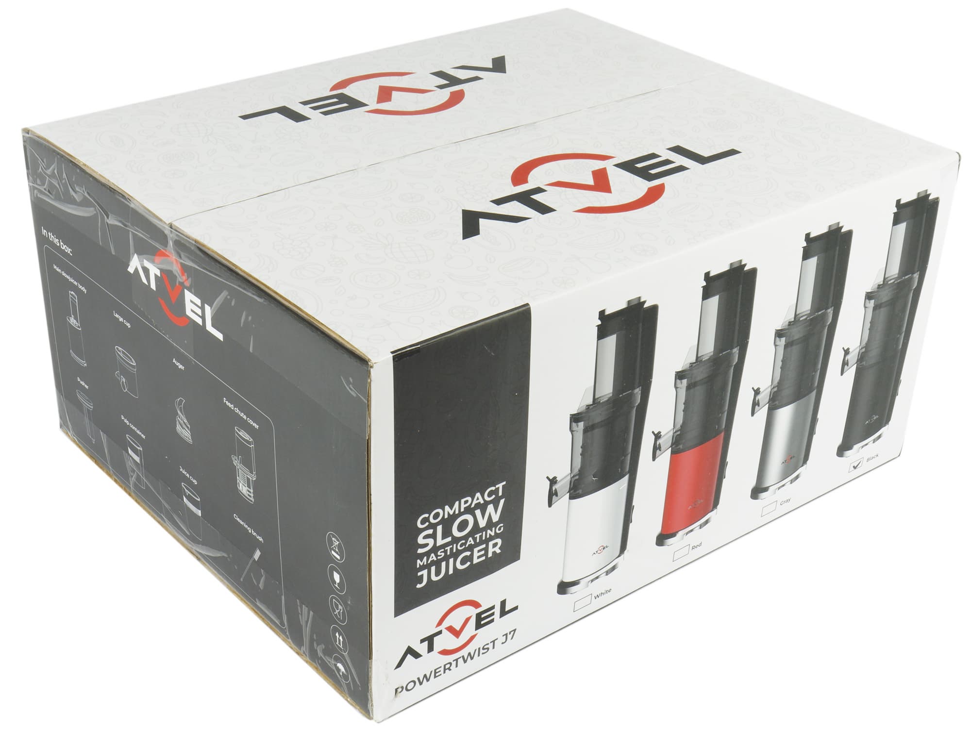 Соковыжималка Atvel PowerTwist J7 приехала к нам в компактной упаковке из прочного глянцевого картона. На гранях коробки, оформленной в фирменной стилистике бренда, размещены: логотип компании, полное название модели, фотографии устройства в четырех цветах, а также краткие технические характеристики и схематические рисунки составных частей соковыжималки.