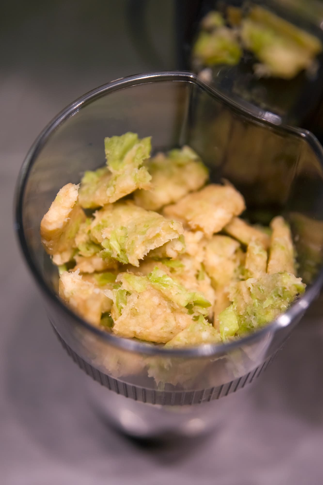 Яблоки у нас были не самые крупные, и в принципе их вполне можно было опускать в горловину целиком или очищенными от сердцевины половинками, но тогда с остановками шнека в ходе поднятия крышки время обработки плодов было бы неточным. Поэтому мы разрезали их на восемь частей и закидывали в отверстие в крышке одну дольку за другой без перерывов.