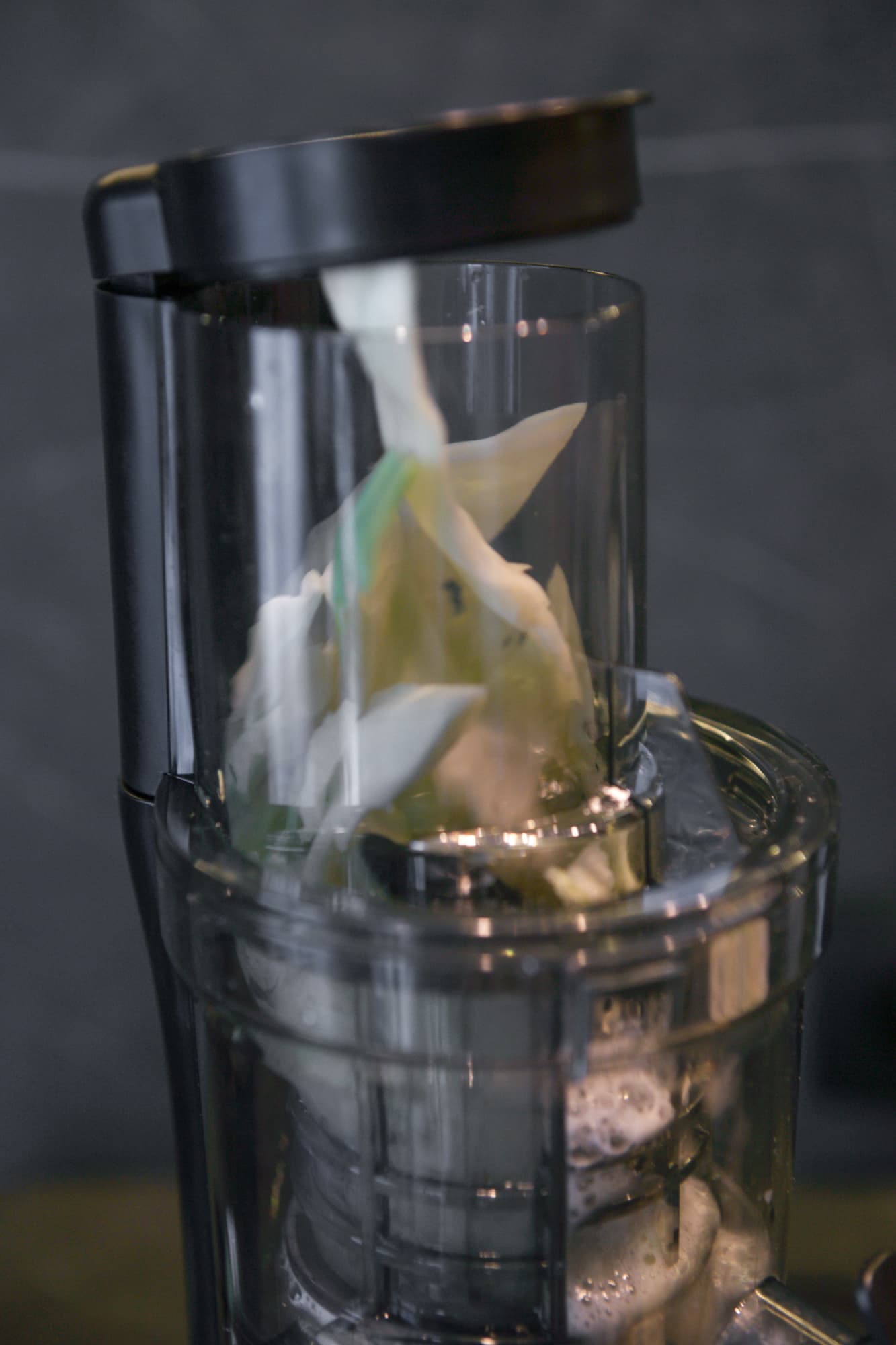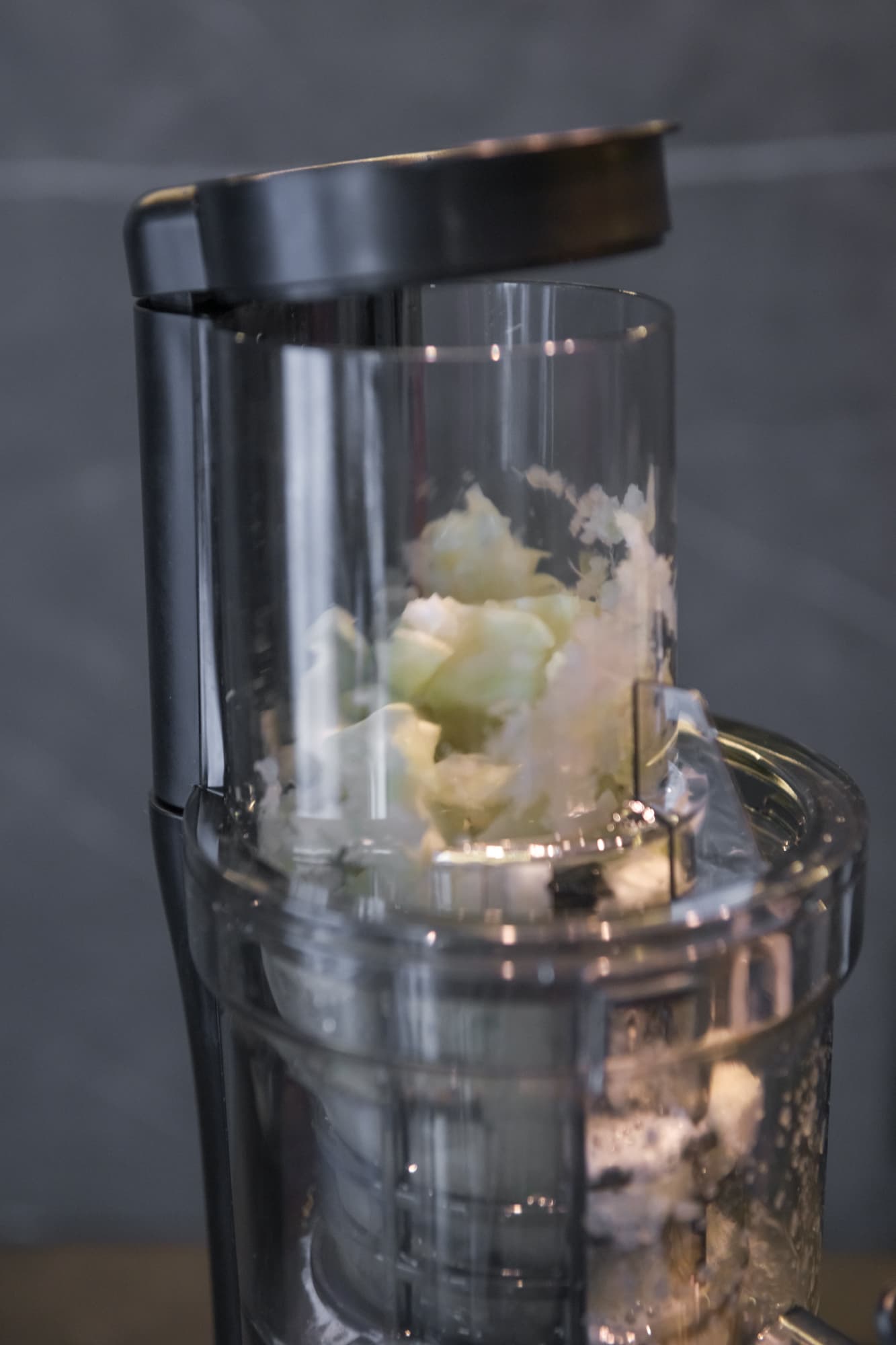 Процесс отжима сока независимо от вида продукта происходит со средней скоростью, без застреваний и пробуксовок и, что особенно приятно, с умеренным шумом. Соковыжималка не сдвигается с места и не вибрирует. Если опустить в горловину слишком много твердых плодов за один раз, передвигаясь вверх-вниз под давлением шнека, они могут приподнимать крышку. Иногда она может приподняться и сама по себе от напряжения всей конструкции в целом. На фото ниже — как раз эти два момента. Снимки сделаны в процессе вращения шнека.