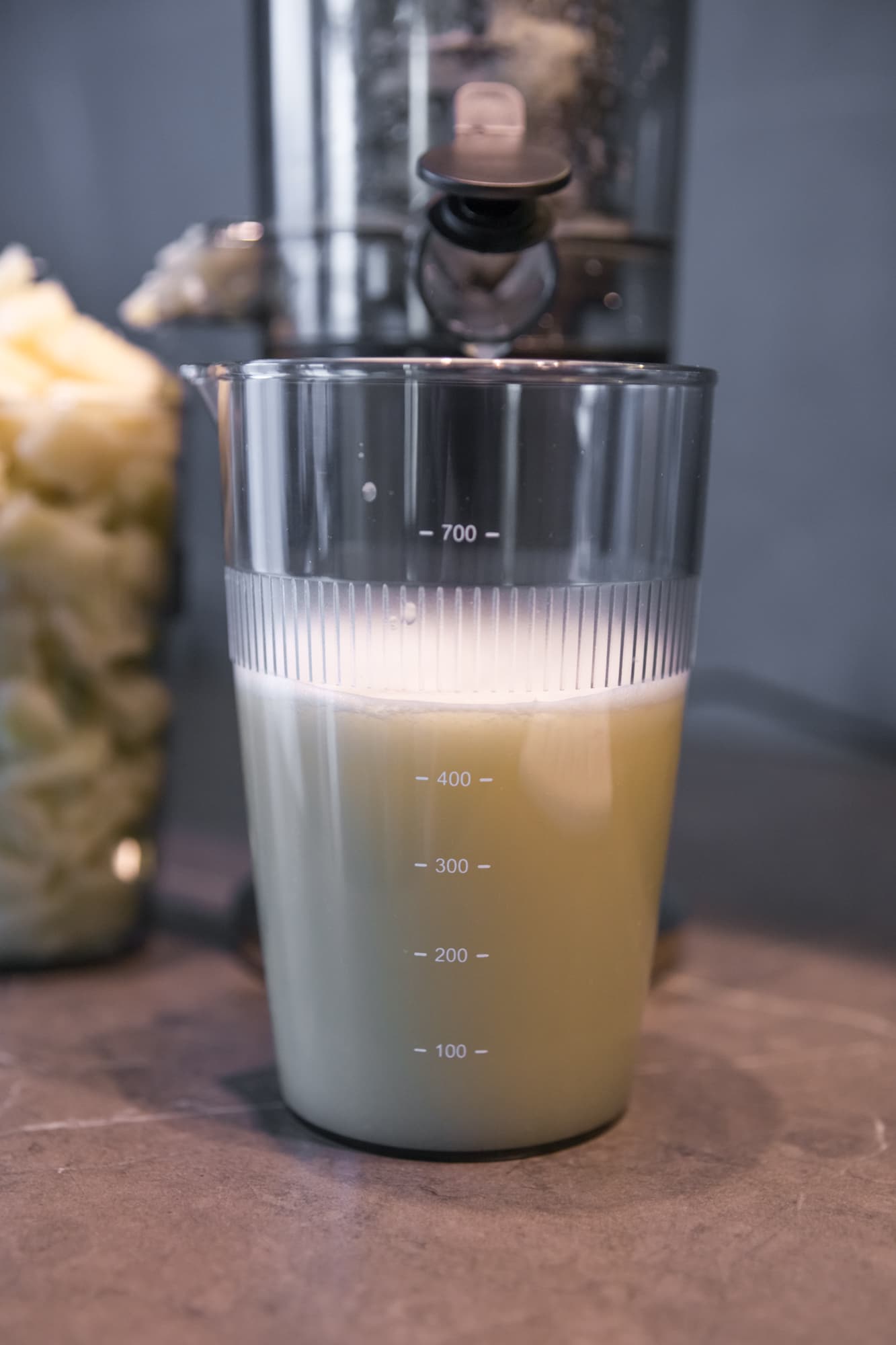Из 500 г ананаса за 2 минуты 15 секунд мы получили 295 г сока без учета пены.