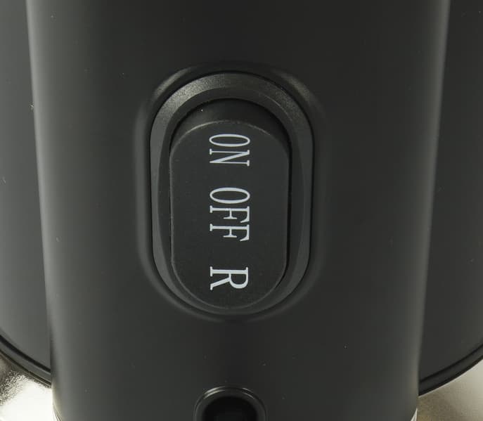 Сбоку к цилиндрическому корпусу прикреплена планка из черного матового пластика, внизу на которой расположена кнопка-переключатель — единственный элемент управления.