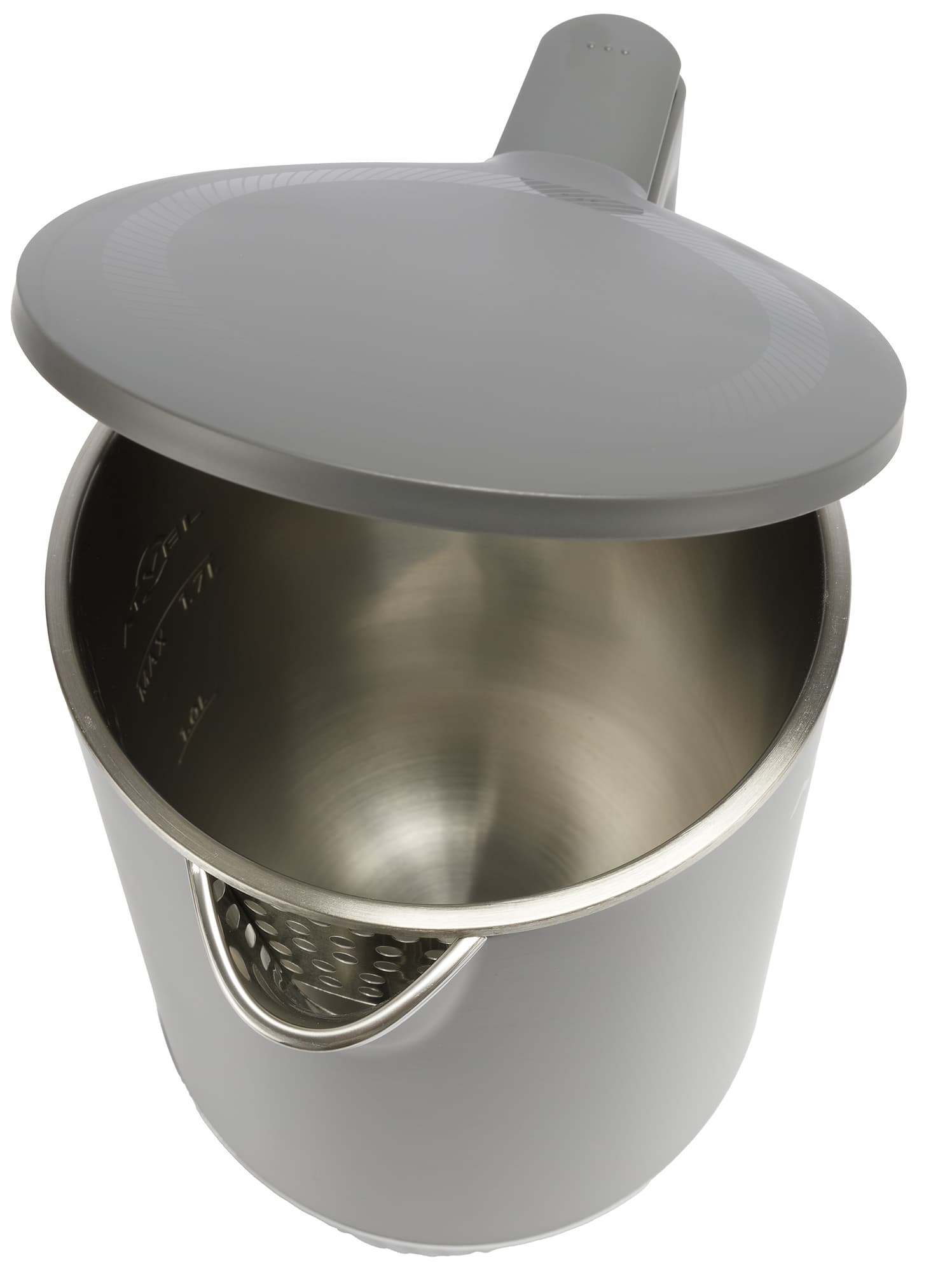 На внутренней стороне емкости выдавлены риски 1 л и Max (1,7 л). Фактически до первой отметки помещается 950 мл, до второй — 1660 мл. Дно чайника гладкое, нагревательный элемент — скрытого типа.