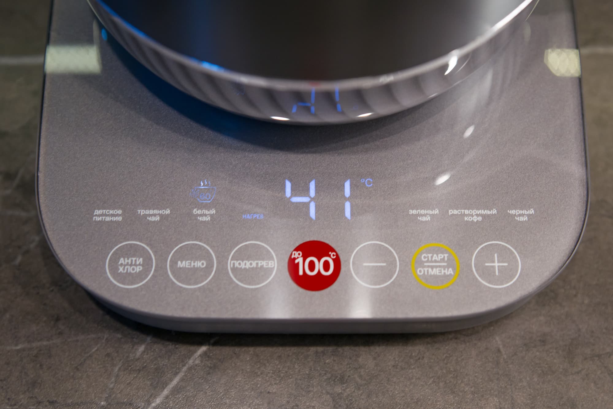 Для кипячения достаточно нажать на красную кнопку с обозначением температуры кипения (100 °C), расположенную по центру панели. В процессе кипячения на дисплее отображается фактическая температура, благодаря чему сразу становится понятно, долго ли осталось ждать. После закипания чайник подает тихий трехкратный звуковой сигнал и автоматически отключает нагрев.