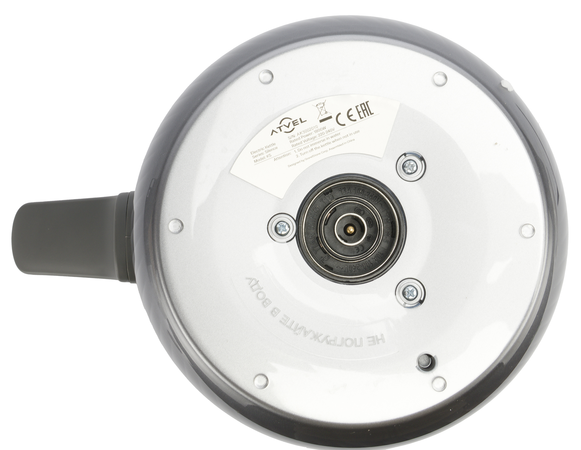 На дне чайника находится шильдик с краткой технической информацией о приборе и контактная группа.