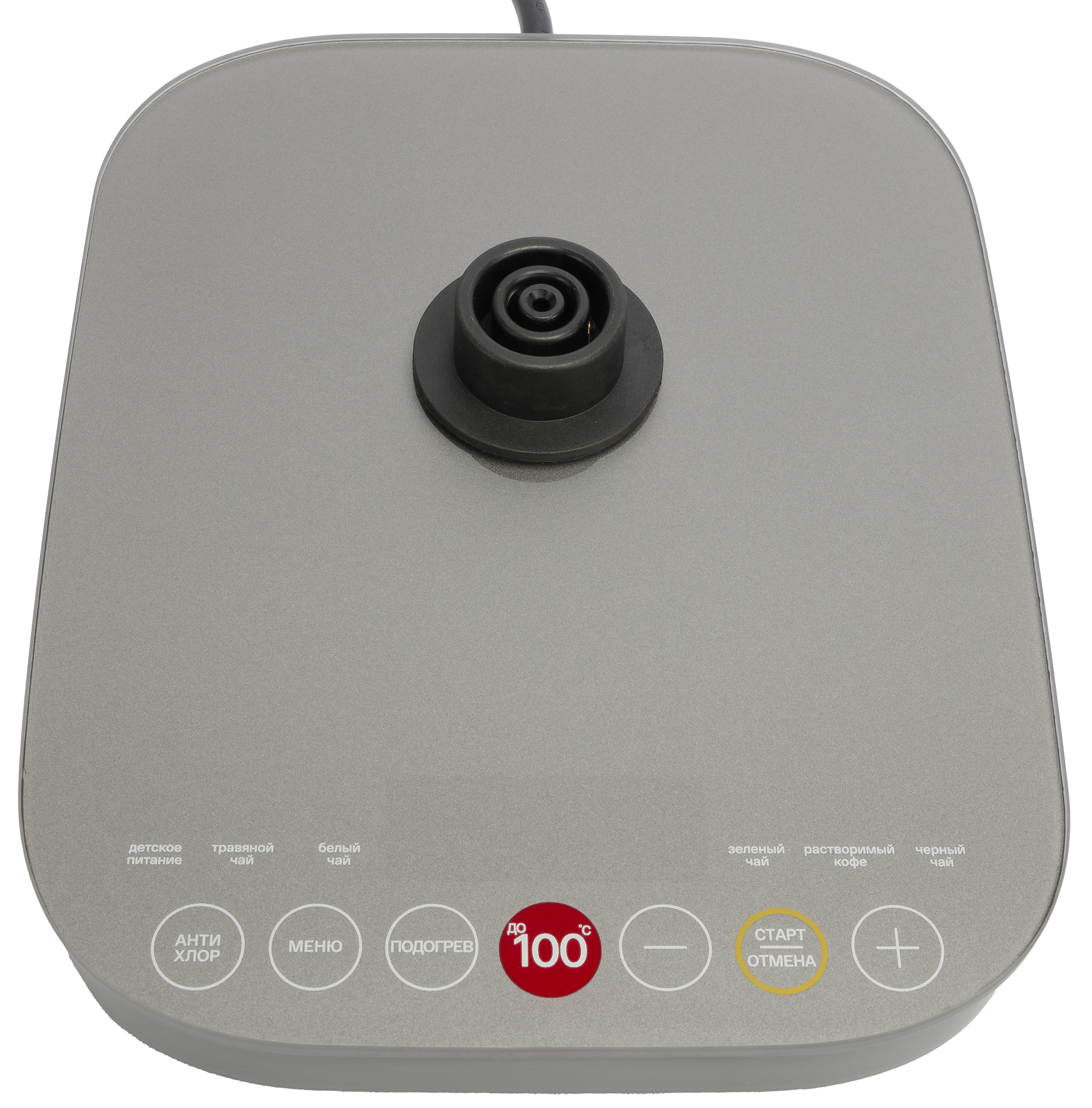 Устойчивая база со скругленными углами выполнена из серого гладкого пластика и покрыта толстым стеклом. На лицевой стороне ближе к внешнему краю размещена сенсорная панель управления. По центру места установки чайника мы видим пластиковую насадку контактной группы.