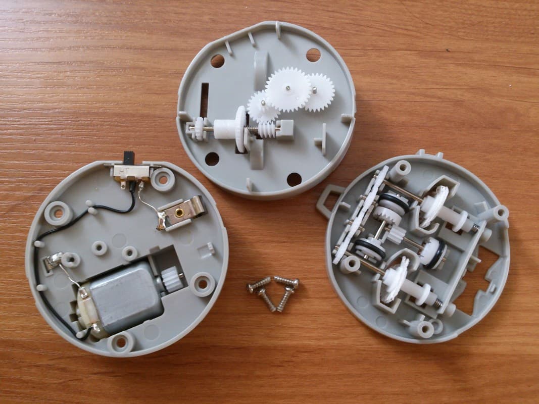 Миниатюрный уборщик можно полностью разобрать и обнаружить внутри небольшой моторчик, а также некоторое количество шестеренок. Обратите внимание, что они закреплены на металлических, а не пластиковых перекладинах.