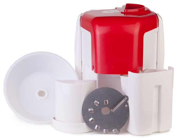 Процесс сборки прибора довольно прост и интуитивен. На электропривод устанавливается рабочий отсек, затем барабан, терочный диск, после чего вся конструкция закрепляется винтом. Затем сверху надевается крышка и легко защелкивается захватами, расположенными с двух сторон электромотора.