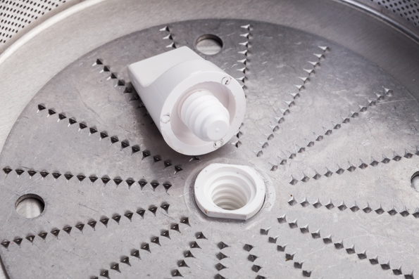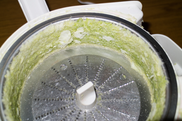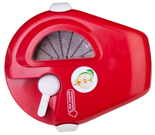 Во время закладки яблок мы столкнулись с их «подпрыгиванием». Диск, по-видимому, вращается так быстро, что гладкий продукт (в случае яблок — глянцевая шкура), попадая на него, отбрасывался. Поэтому все кусочки продуктов необходимо прижимать к диску с помощью толкателя. Через некоторое время мы приноровились закидывать и почти одновременно прижимать половинку яблока толкателем. С другими продуктами таких проблем не возникало.
