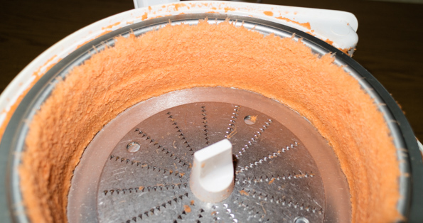В целях эксперимента было замерено время, которое у нас ушло на разборку, очистку, мытье и протирку соковыжималки. Очевидно, что показания времени средние и сильно зависят от скорости работы конкретного человека, от вида перерабатываемого сырья, от требований к качеству уборки, в конце концов. В целом, данные процессы заняли у нас около 7-8 минут. На очистку пластиковых деталей от следов моркови времени было затрачено значительно больше: для качественной очистки нам потребовалось протирать рабочий отсек и лоток для шинкования растительным маслом. После переработки моркови указанные детали приобрели ярко-оранжевый цвет, не отмывшийся даже в посудомоечной машине. Никакой опасности для здоровья оранжевый цвет лотка не представляет, однако наши эстетические чувства были несколько обескуражены, поэтому пришлось вспоминать старые бабушкины средства.