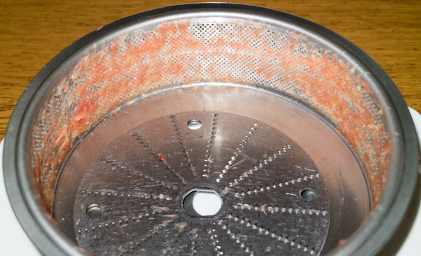 Отверстия барабана без особых усилий и затруднений очищаются при помощи щетки под струей воды. Однако перед этим мы вручную убирали почти сантиметровый слой отжатого продукта.