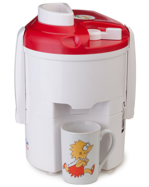 Прибор выглядит как обычная соковыжималка позднесоветского периода. Обычный белый и красный пластик, никаких дизайнерских изысков, никаких конструкторских открытий. Вот только один стакан нас несколько смутил. Куда же его подставить? Под сок или под жом? Производитель на сайте сообщает, что один рабочий стакан экономит место на кухне, а для жома можно использовать любую удобную для пользователя тару. При этом на фотографии прибора комплектный стакан расположен ровно под отсеком для сброса отжатого сырья. Собственно, покрутив тару и так, и эдак, было решено устанавливать ее именно под отсеком для сброса жома, а для сока взять любую подходящую пол высоте емкость. Идеально подошла обычная стеклянная 850-граммовая банка.