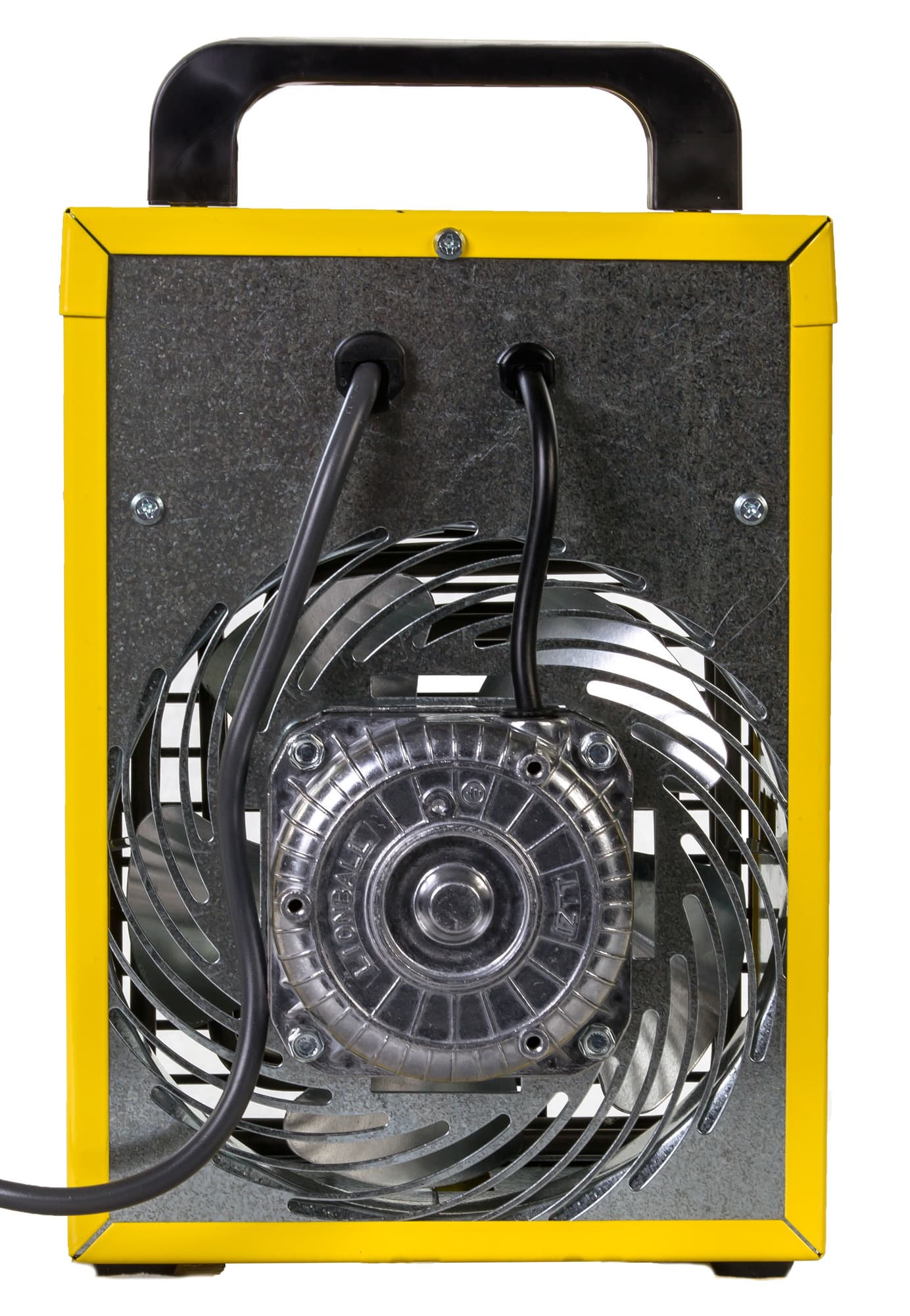 Снизу у пушки находятся резиновые ножки, на задней стенке закреплен вентилятор, спереди можно увидеть защитную решетку и две вращающиеся ручки управления. Через решетку хорошо видны лопасти вентилятора и нагревающий элемент (спираль). Сверху предусмотрено крепление для ручки (поставляется в комплекте с обогревателем).