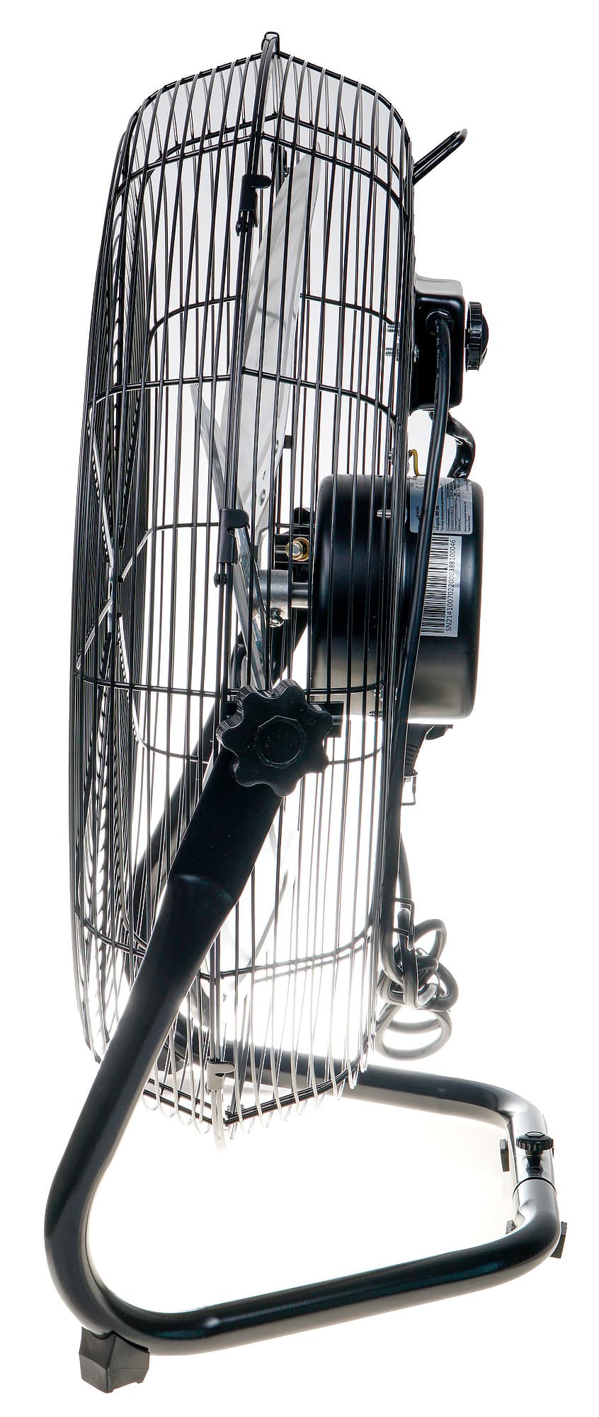 После установки подставки пользователь может регулировать угол наклона вентилятора, ослабив боковые винты и затянув их заново после установки нового угла наклона.