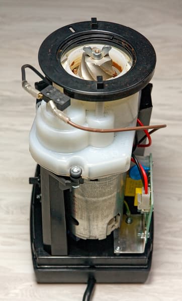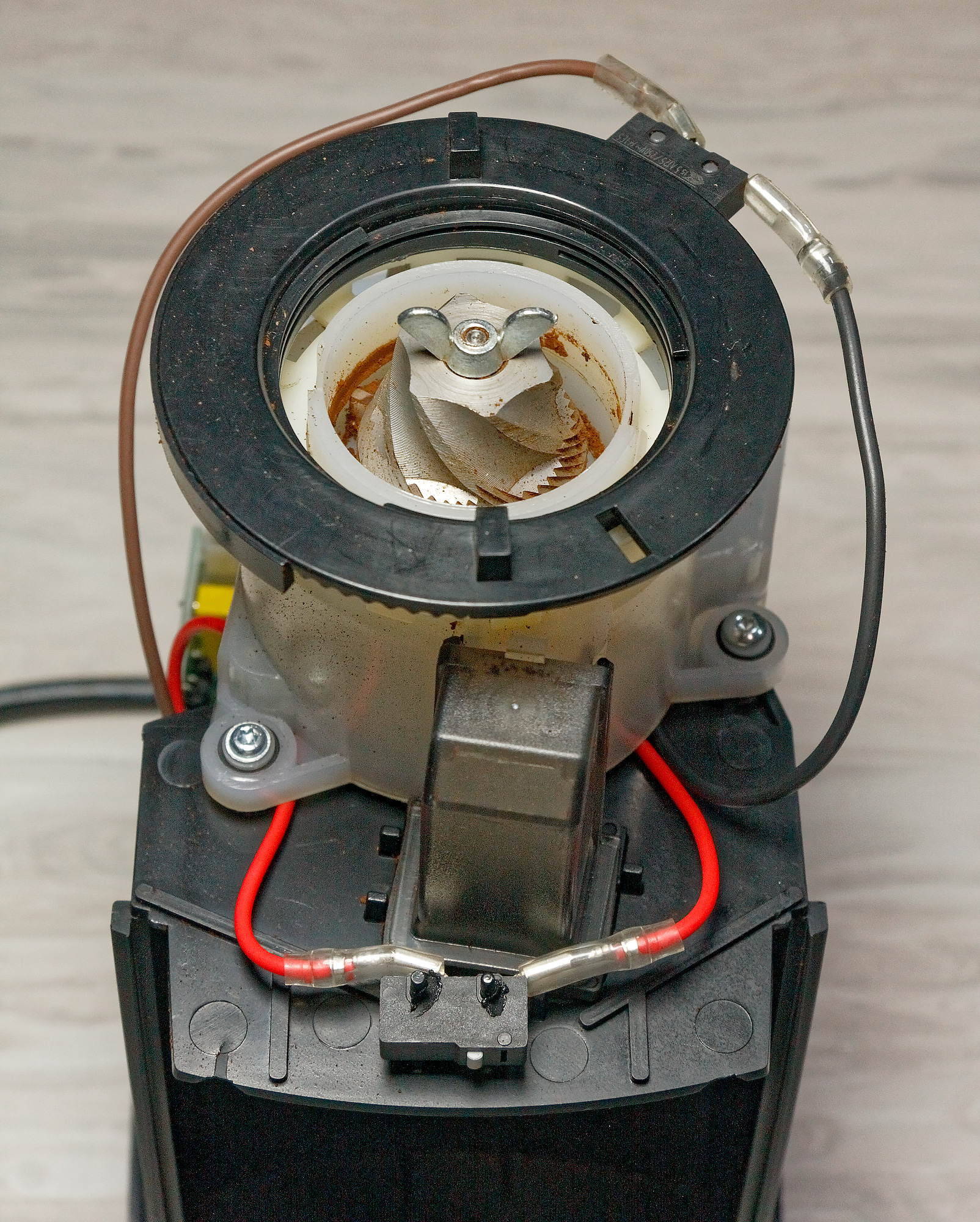 Зато благодаря этому происшествию нам удалось сделать несколько фотографий внутренностей прибора. Боялись мы, как оказалось, зря: механизм редуктора оказался спрятан внутрь своего собственного пластикового корпуса, а следовательно, затруднить его работу частицам кофе будет не так-то просто.