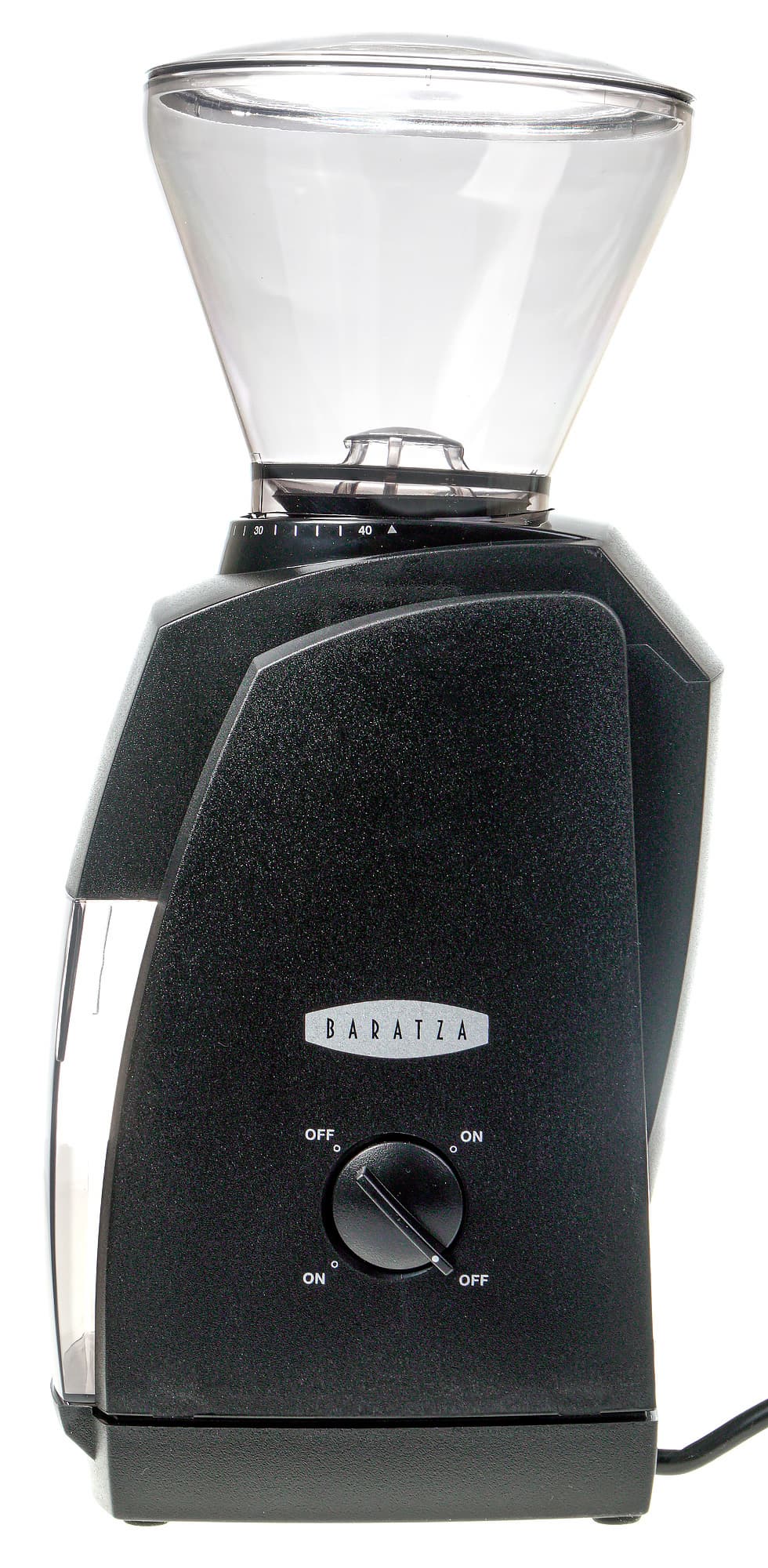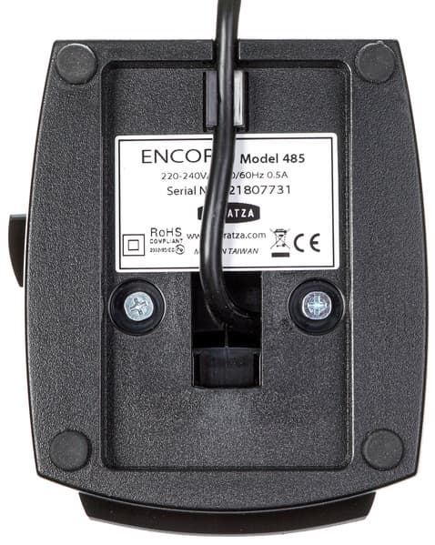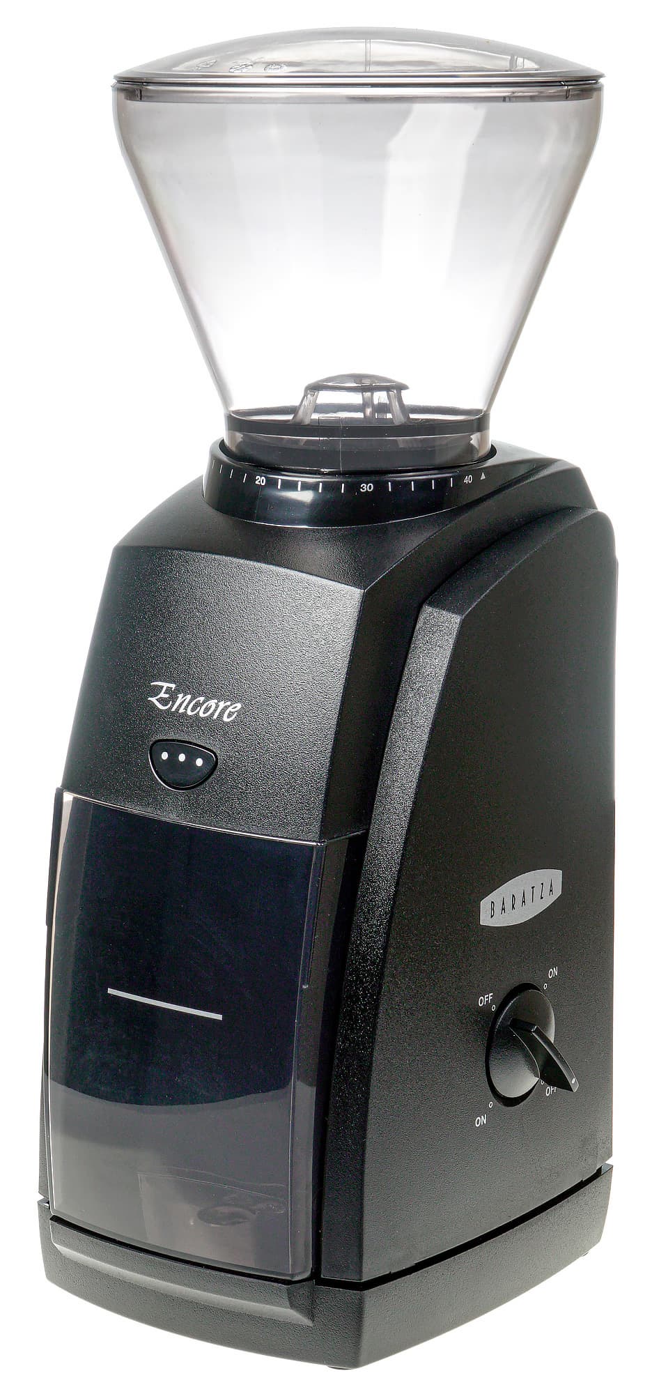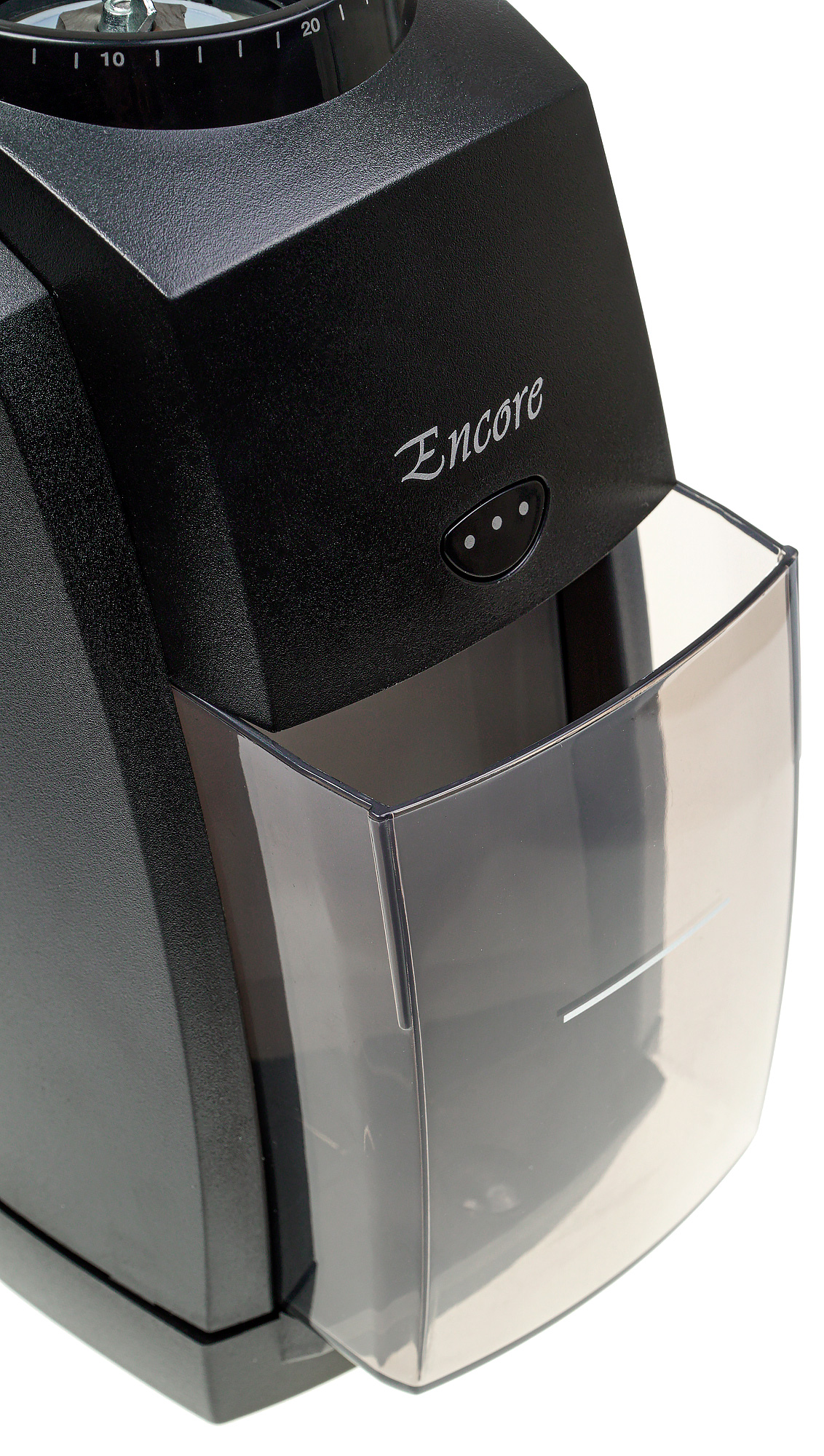 Спереди у кофемолки можно увидеть место для установки бункера для помола емкостью 5 унций (142 г) — он фиксируется с помощью небольшого пластикового «язычка», и кнопку для включения импульсного режима помола. Над кнопкой находится название модели — Encore. На бункере имеется горизонтальная черта, по всей видимости, призванная напомнить о том, что в какой-то момент нужно остановить помол и высыпать содержимое.