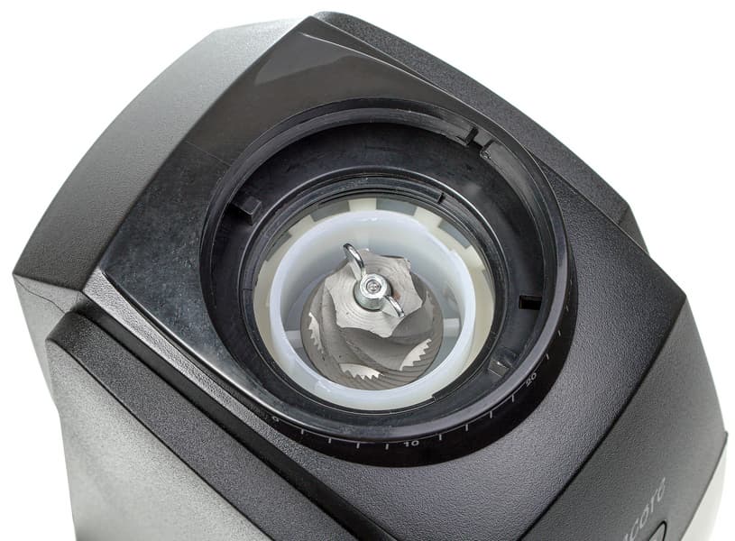 Хоппер вмещает в себя 8 унций кофейных зерен, что примерно равняется 227 г кофе. По совместительству хоппер выполняет функцию регулировки степени помола: для настройки нужно совместить риску на контейнере с нужной риской на корпусе устройства.