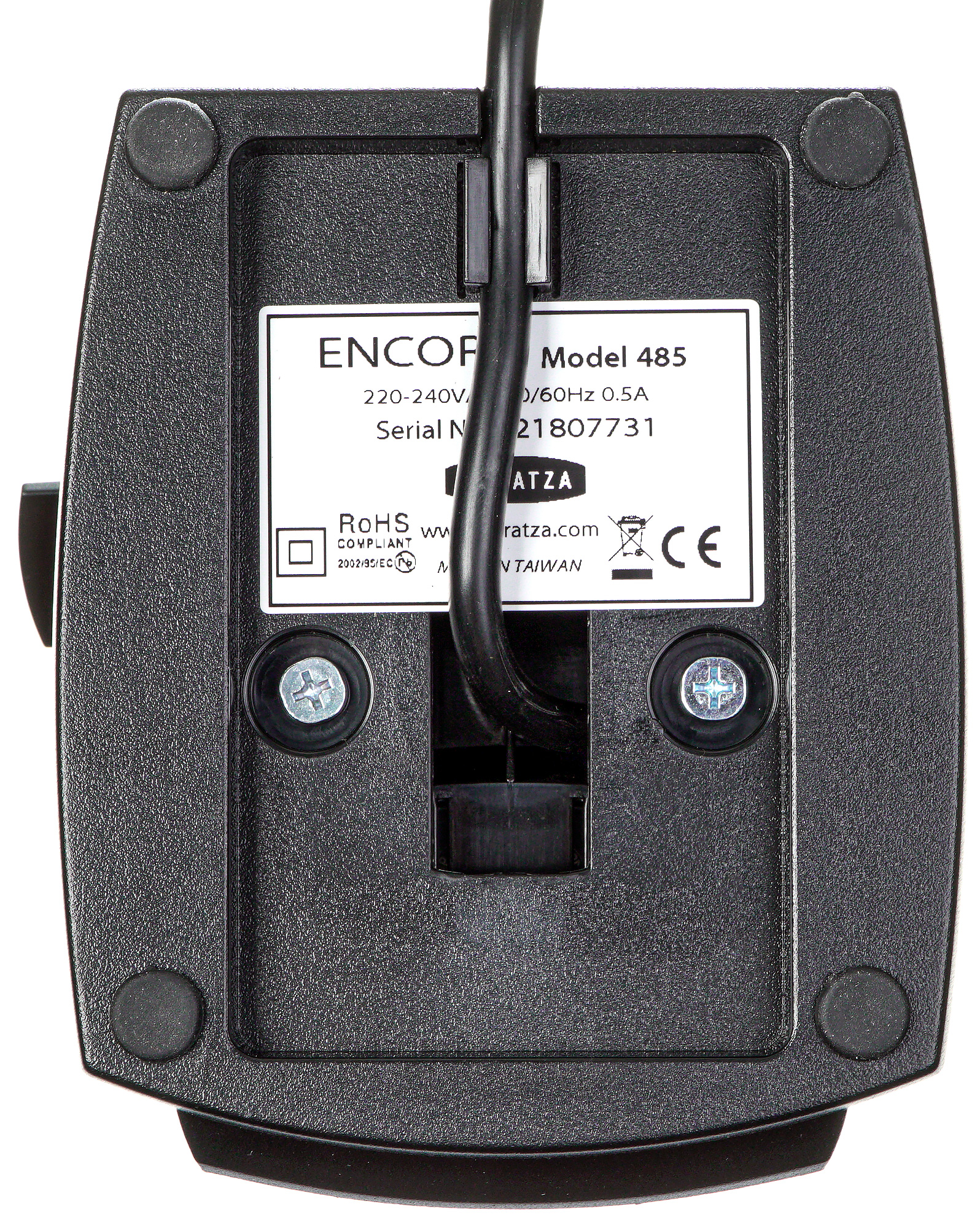 С нижней стороны можно увидеть наклейку с серийным номером, резиновые ножки, препятствующие скольжению, и устройство для фиксации шнура электропитания.