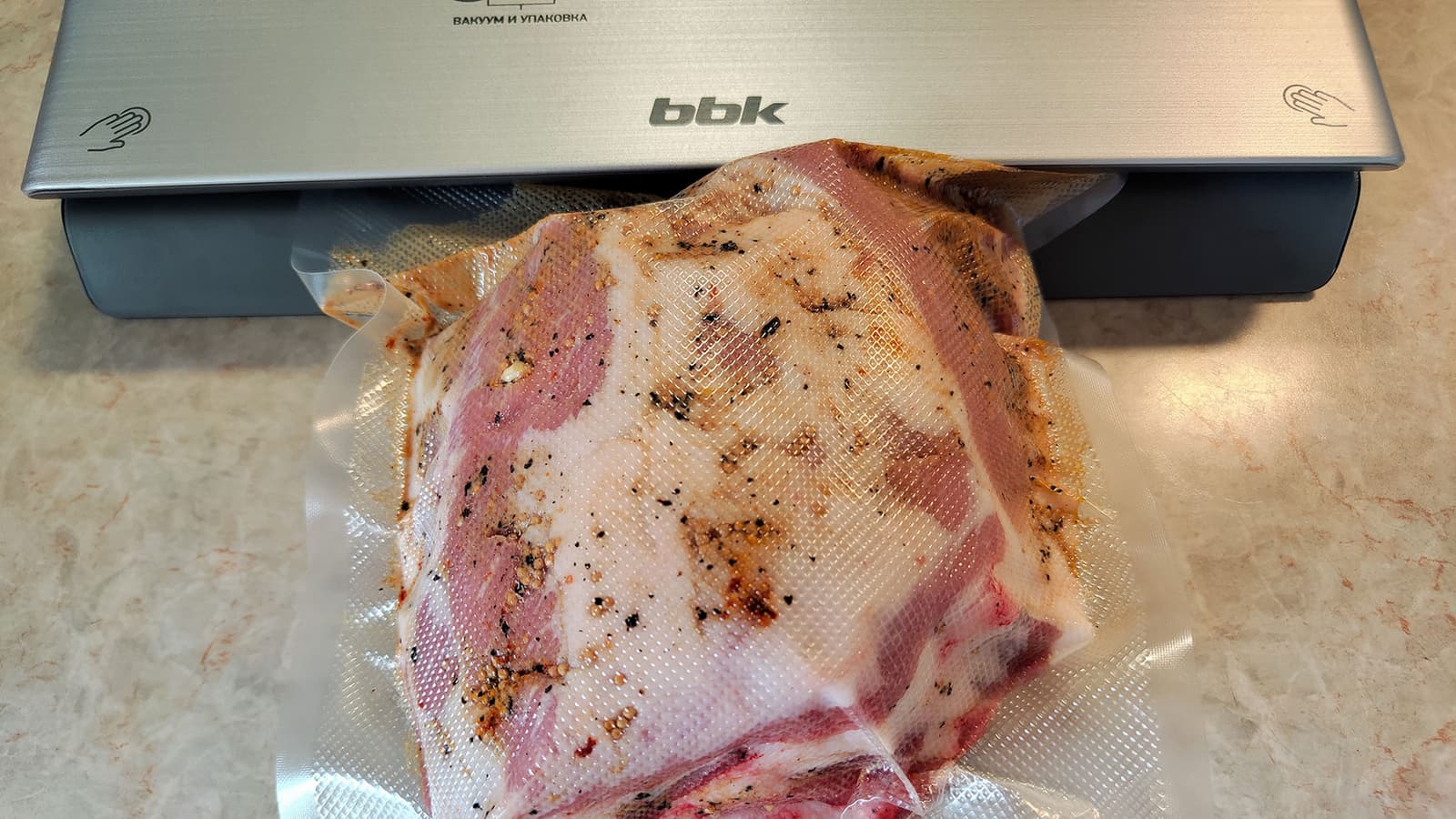 Вообще вакуумирование и упаковка более чем несложны и занимают совсем немного времени, но результаты работы упаковщика нас по-настоящему порадовали. Особенно восхитила возможность запаивать влажные пакеты, не следить за чистотой внутренних стенок, что очень важно, когда упаковываешь продукты с маринадом. Вакууматор BBK BVS803 за всё время эксплуатации проявил себя как очень комфортный, предсказуемый и некапризный прибор.