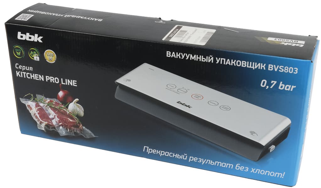 По результатам визуального знакомства и тестирования мы остались чрезвычайно довольны вакуумным упаковщиком BBK BVS803. Прибор оснащен всем необходимым для операций откачки воздуха и запаивания пакета: три режима мощности вакуумирования — для сухих, влажных и очень сочных продуктов, три режима работы — автоматическая упаковка, откачка воздуха из контейнера, запаивание пакета. Дополнительные аксессуары — набор пакетов, нож, два вакуумных шланга — делают взаимодействие с упаковщиком еще приятнее.