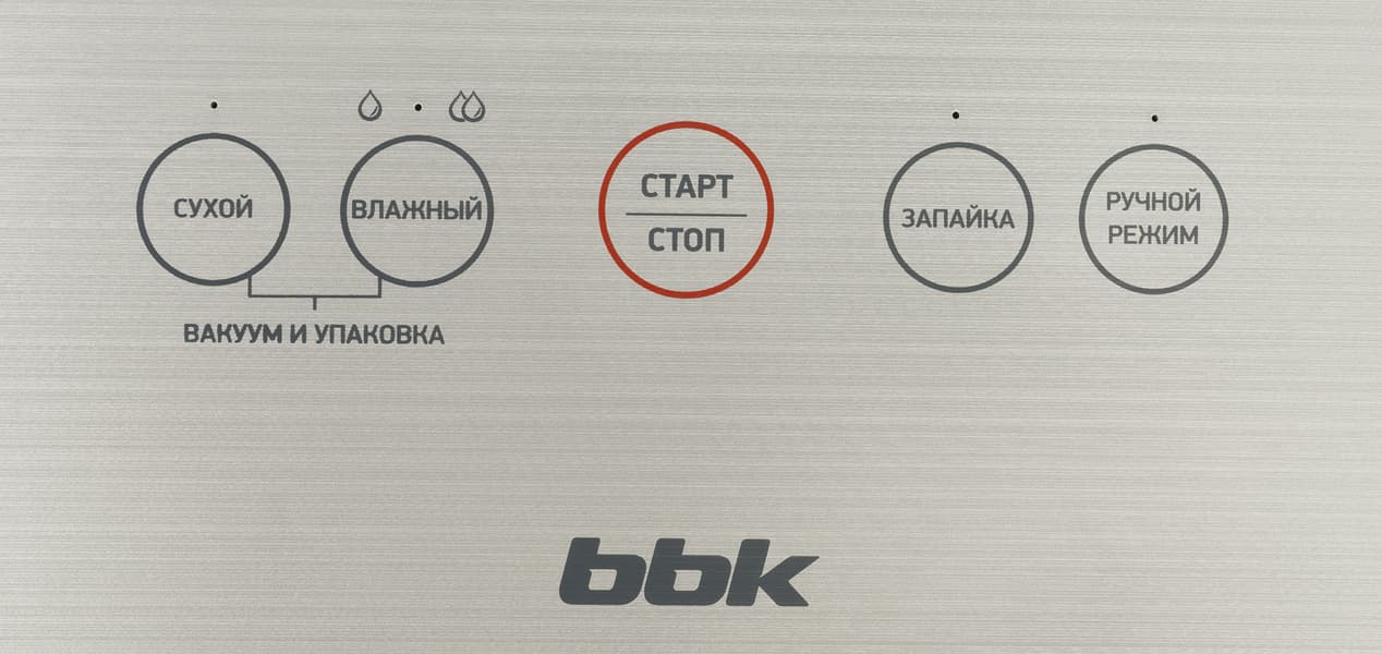 Режим выбирается нажатием на кнопки в левой стороне панели: однократное нажатие на кнопку «Влажный» запускает вакуумирование и запайку продуктов с небольшим содержанием влаги, двукратное нажатие подходит для сочных продуктов.