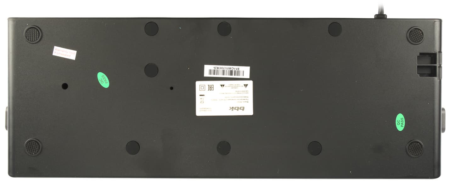 Со стороны дна привлекают внимание четыре невысокие ножки, оснащенные прорезиненной вставкой для более устойчивого положения на столе, и наклейки: серийный номер и краткая техническая информация об изделии.