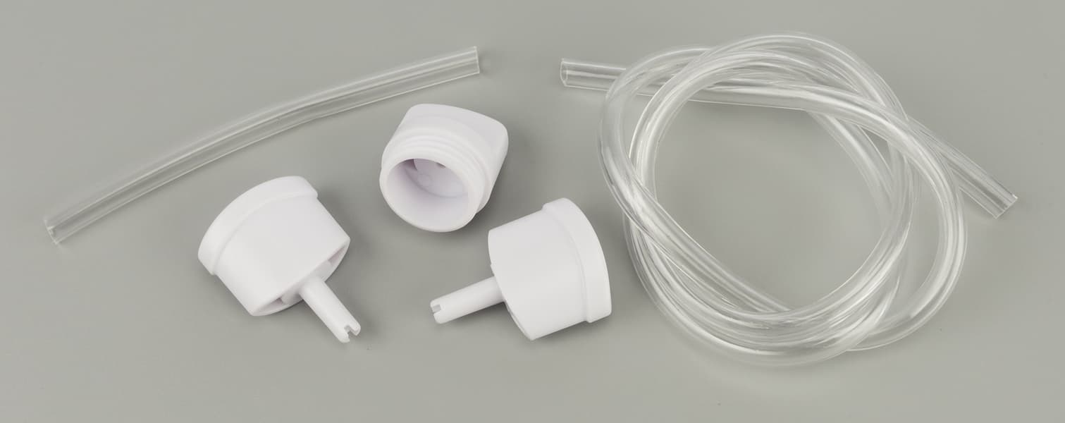 Прибор укомплектован двумя силиконовыми вакуумными шлангами: длиной 71 см и коротким 10-сантиметровым. На шланг надеваются фиксатор для присоединения к вакууматору и переходник-разъем для контейнера.