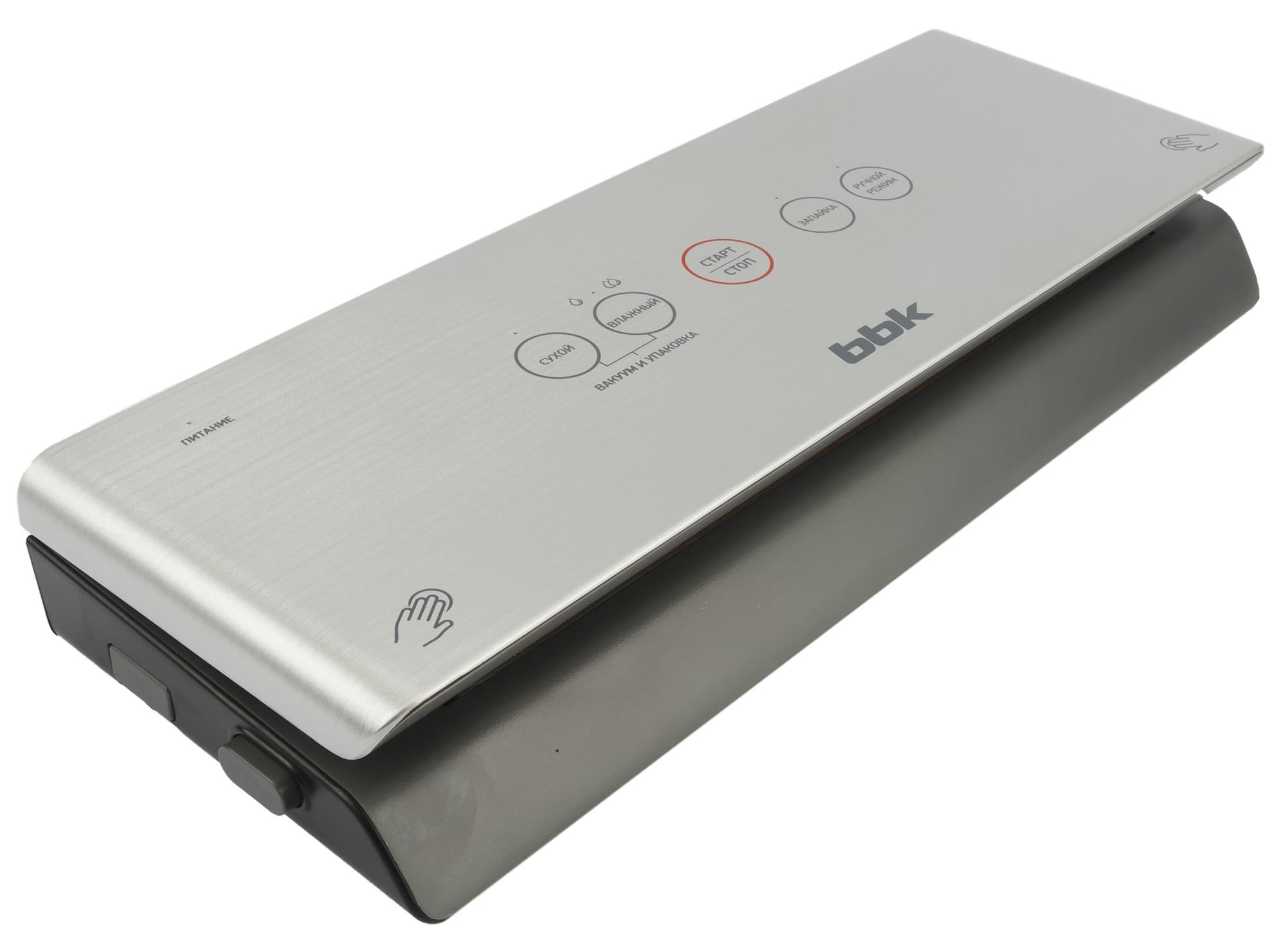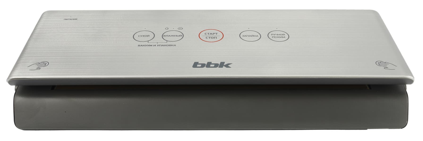 Элементы управления расположены в привычном и наиболее удобном месте — на крышке вакууматора. Сенсорные кнопки снабжены индикаторами и надписями на русском языке.