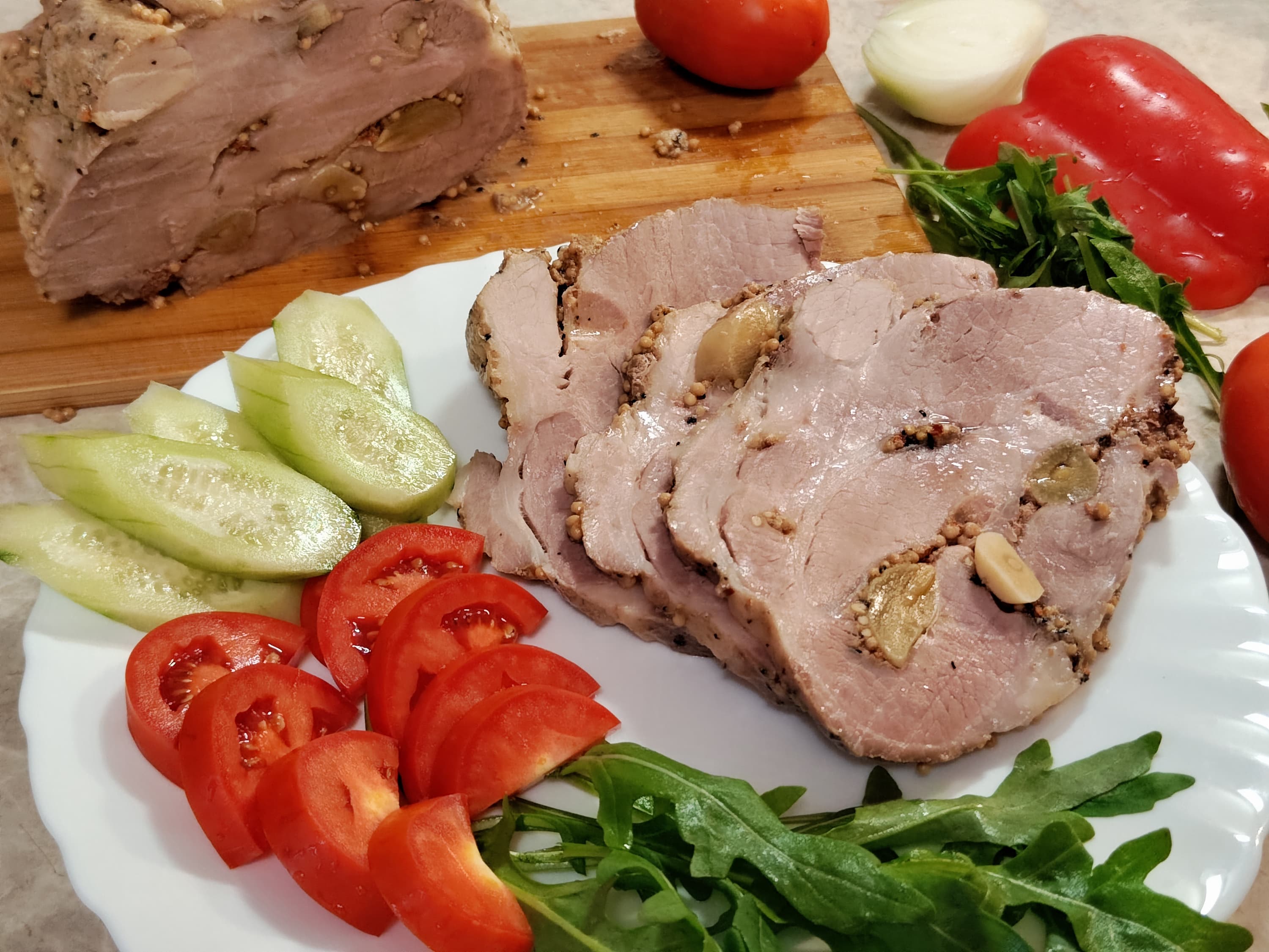 Через пару суток (раньше просто не нужно было) сварили мясо на 76 °C. Мякоть нежнейшая, приятного розоватого цвета, ароматная и чрезвычайно вкусная.