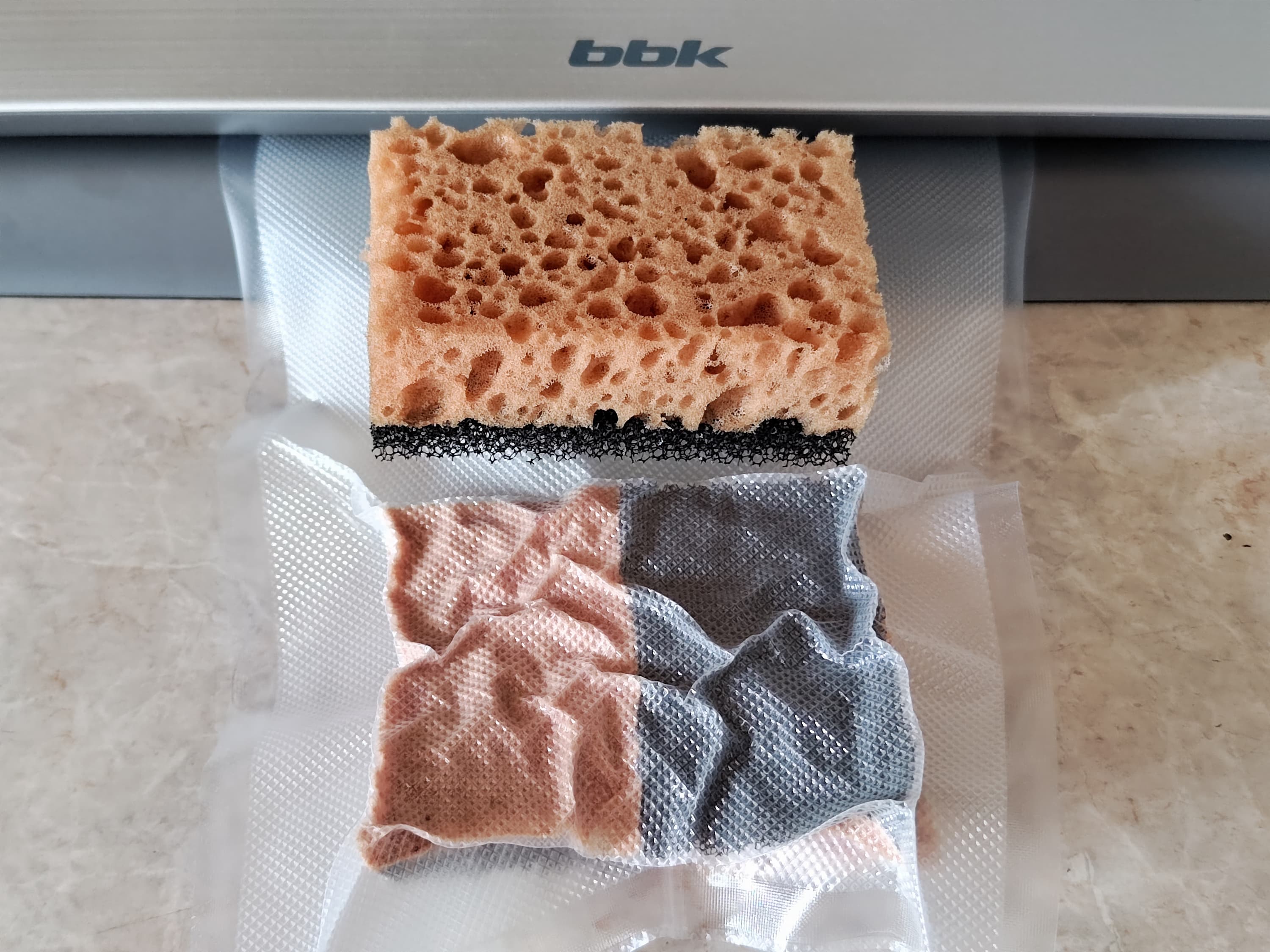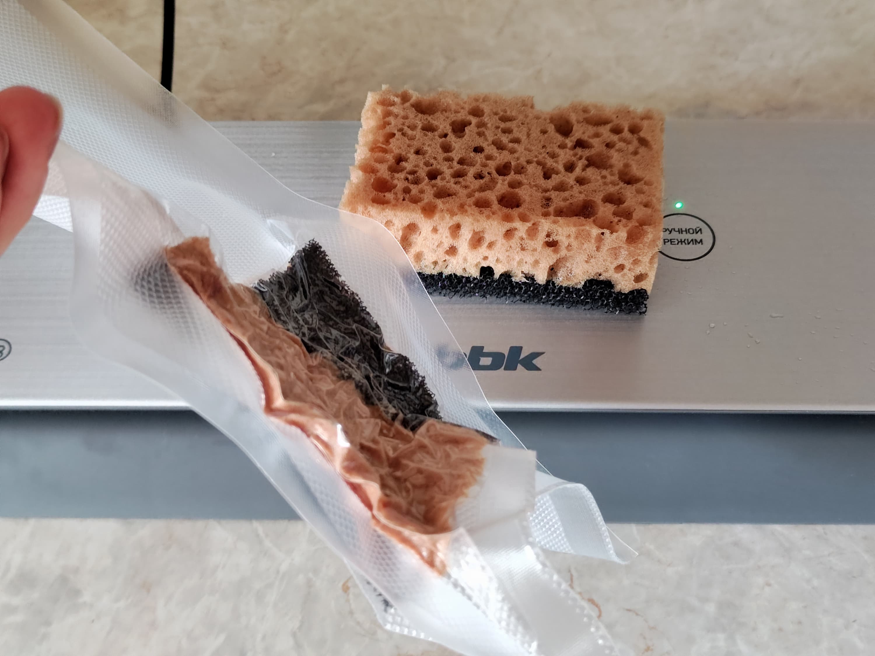 В целом, с аппаратом всё уже понятно, но напоследок продемонстрируем результаты, возможно, не самого эстетичного, зато достаточно зрелищного теста. Мы взяли две обычные губки для мытья посуды, положили их в комплектный пакет, выбрали режим работы с сухими продуктами и запустили автоматическую программу откачки воздуха и запайки пакета.