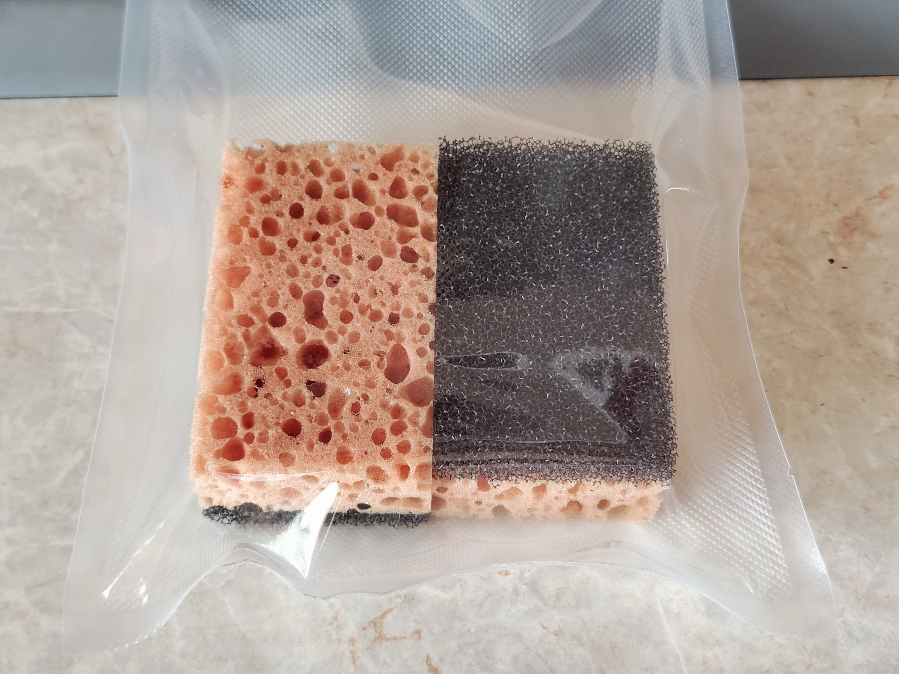 Выглядел процесс поистине завораживающе. Насколько уменьшился размер губок, наглядно видно на фотографии: две губки по периметру сжались до размеров одного изделия в нормальном состоянии, а о ширине нечего и говорить — без воздуха губки стали то-о-оненькие-то-о-оненькие.