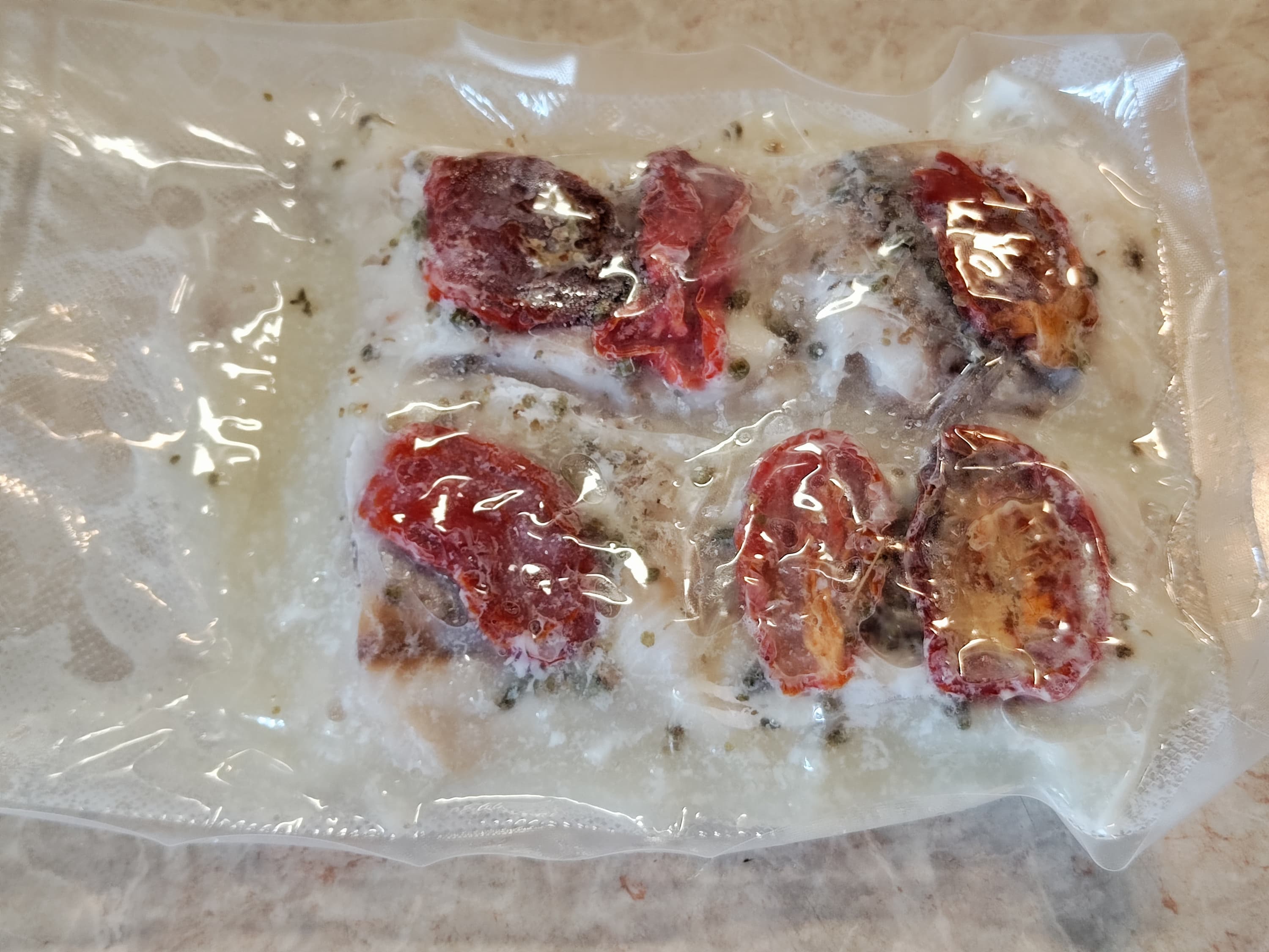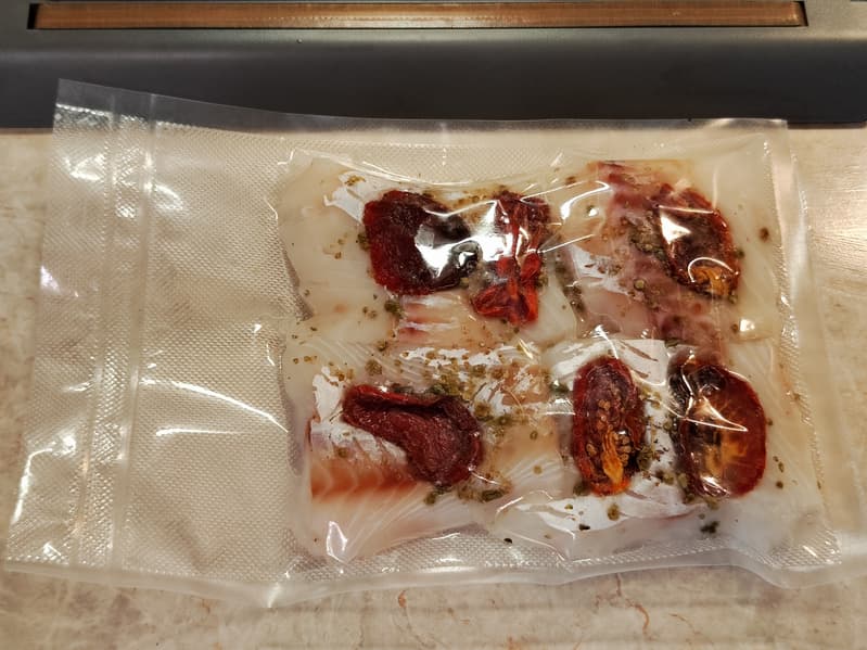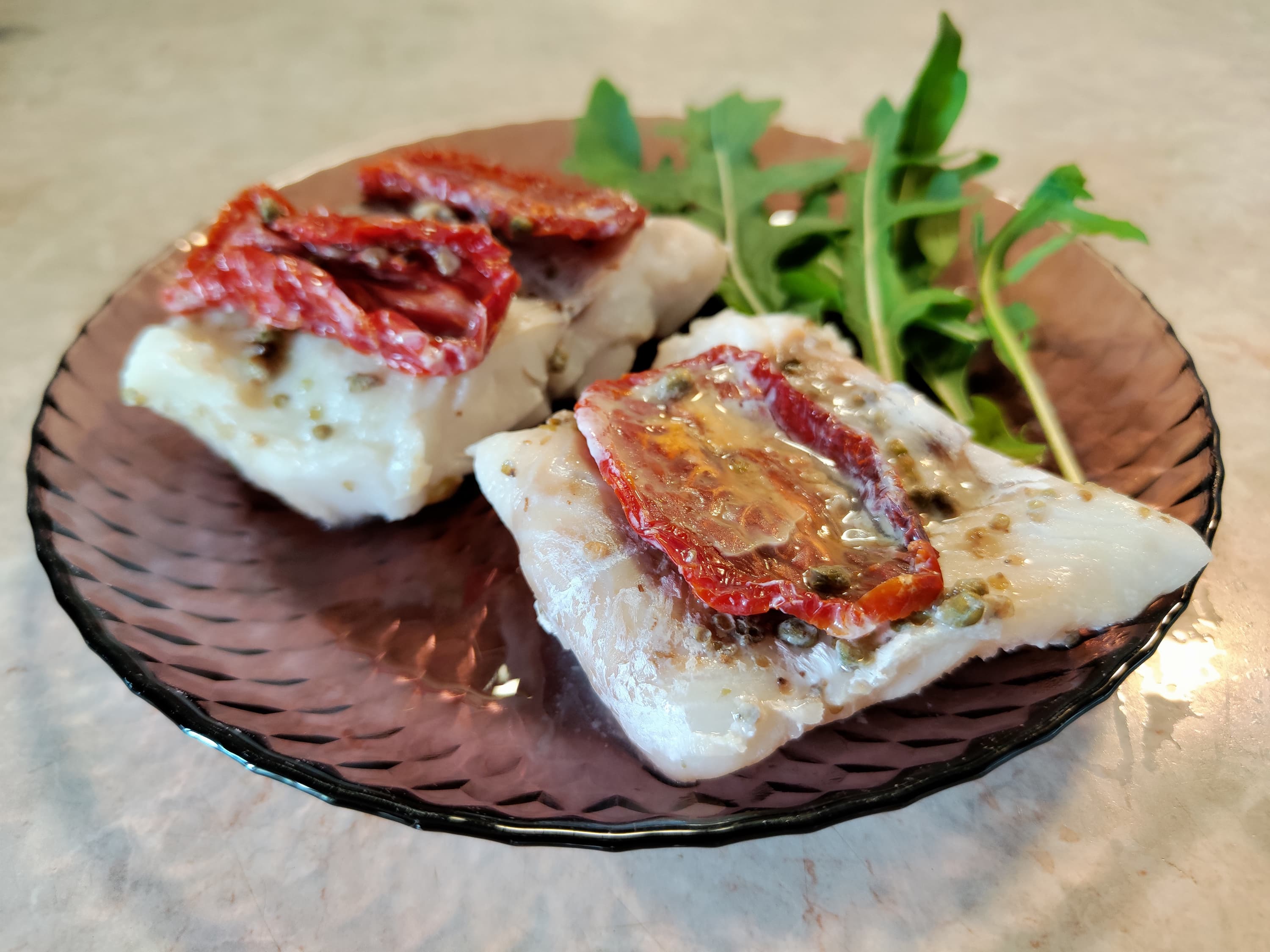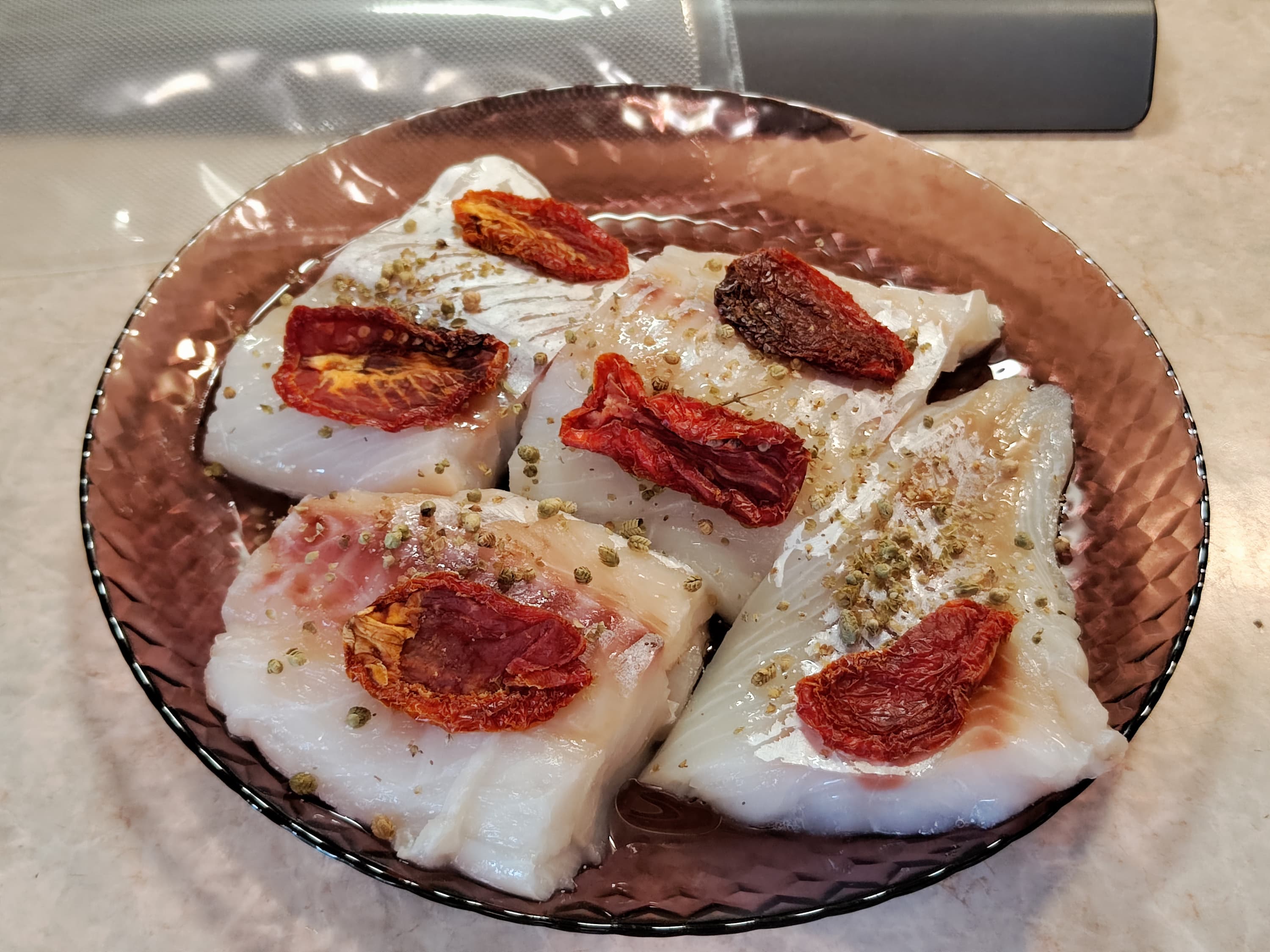 С самого начала мы решили проверить, на что способен прибор. Разморозили треску, слили выделившуюся жидкость, посолили, посыпали специями, украсили вялеными помидорами.