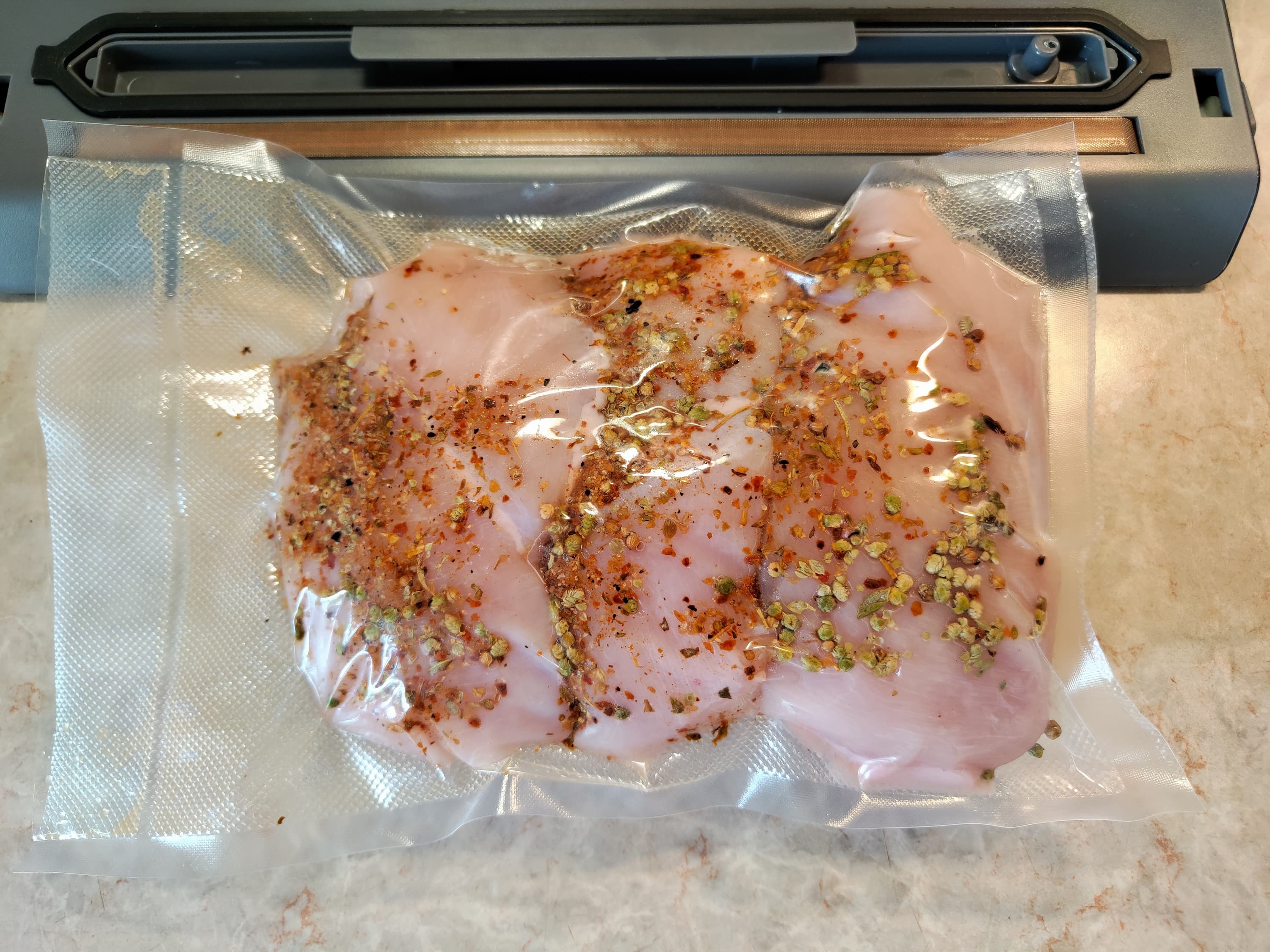 Три больших куска грудки общим весом около килограмма обмазали смесью специй, посыпали травами и положили в комплектный пакет.