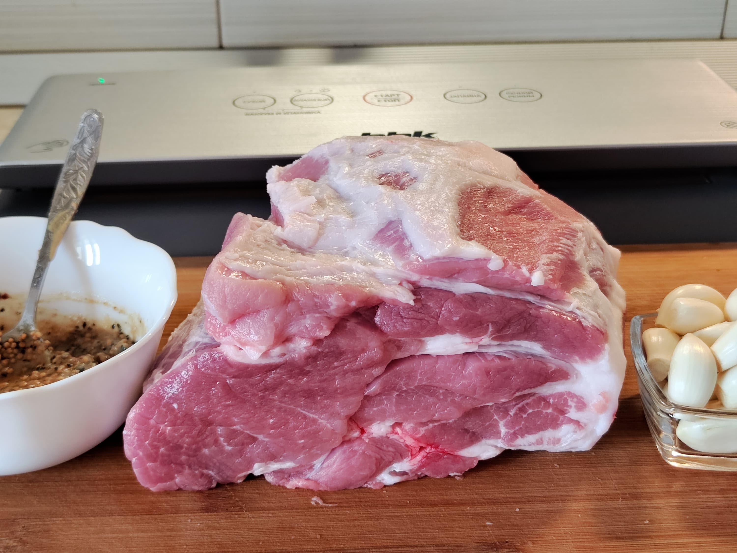 Признаемся, что уже давно перестали запекать буженину в духовке, полностью перейдя на низкотемпературную варку. Мясо получается значительно нежнее и мягче, чем запеченное, а желающим похрустеть подрумяненной корочкой можно посоветовать быструю обжарку в гриле или на раскаленной сковороде. Вот и в этот раз обмазали большой кусок шеи смесью специй, в основном состоящей из горчицы и горчичного зерна, нашпиговали дольками чеснока и попытались впихнуть сие великолепие в комплектный пакет.