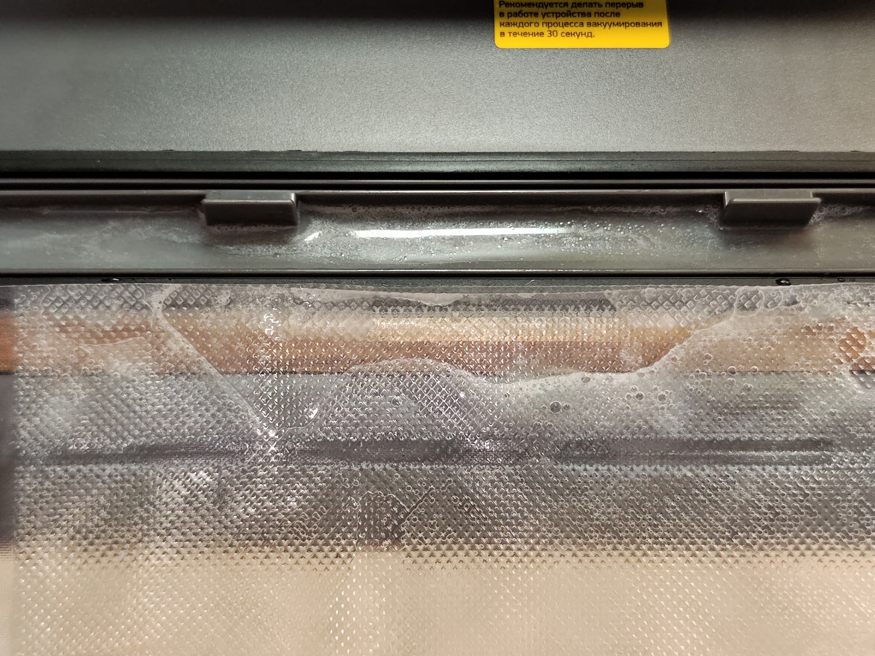 Треска была очень влажной, из нее выделялось чрезвычайно много воды и без вакуумирования, при включении же откачки воздуха влага почти сразу вместе с воздухом хлынула в съемную емкость вакуумной камеры. Тем не менее, вакууматор честно попытался запаять шов — и местами ему это даже удалось. Мы повторили опыт, но вновь безуспешно, и винить за это прибор не стоит. Шов слишком мокрый.