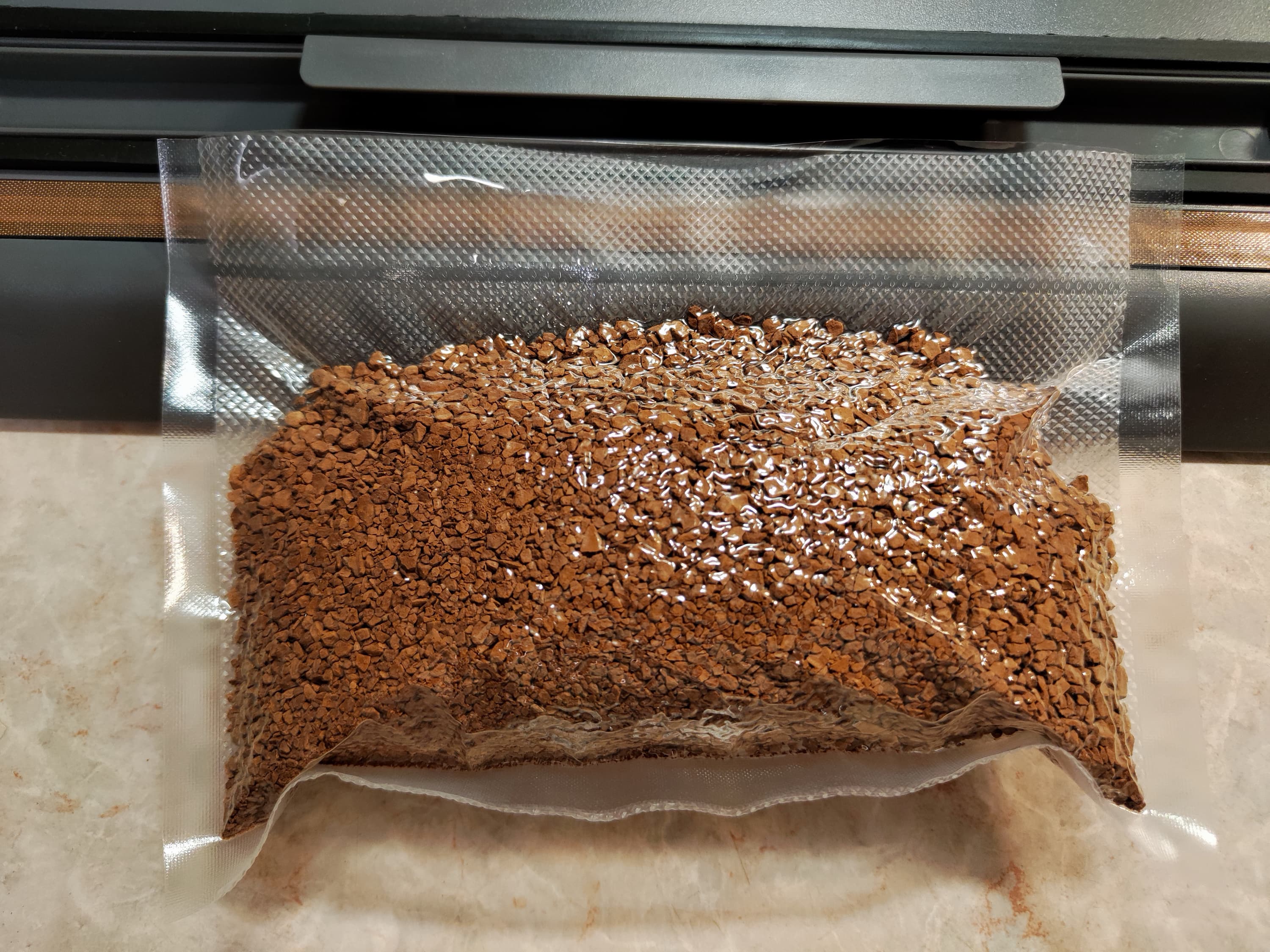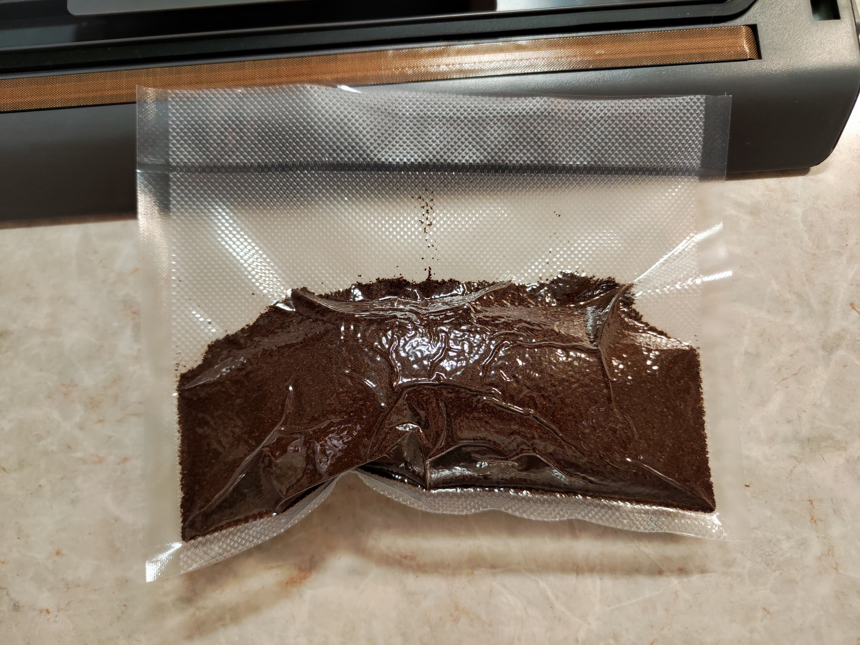 Выше можно видеть результат: продукт завакуумирован, воздух удален, кофе внутрь запайки шва не попал. Ну каков прибор, а!