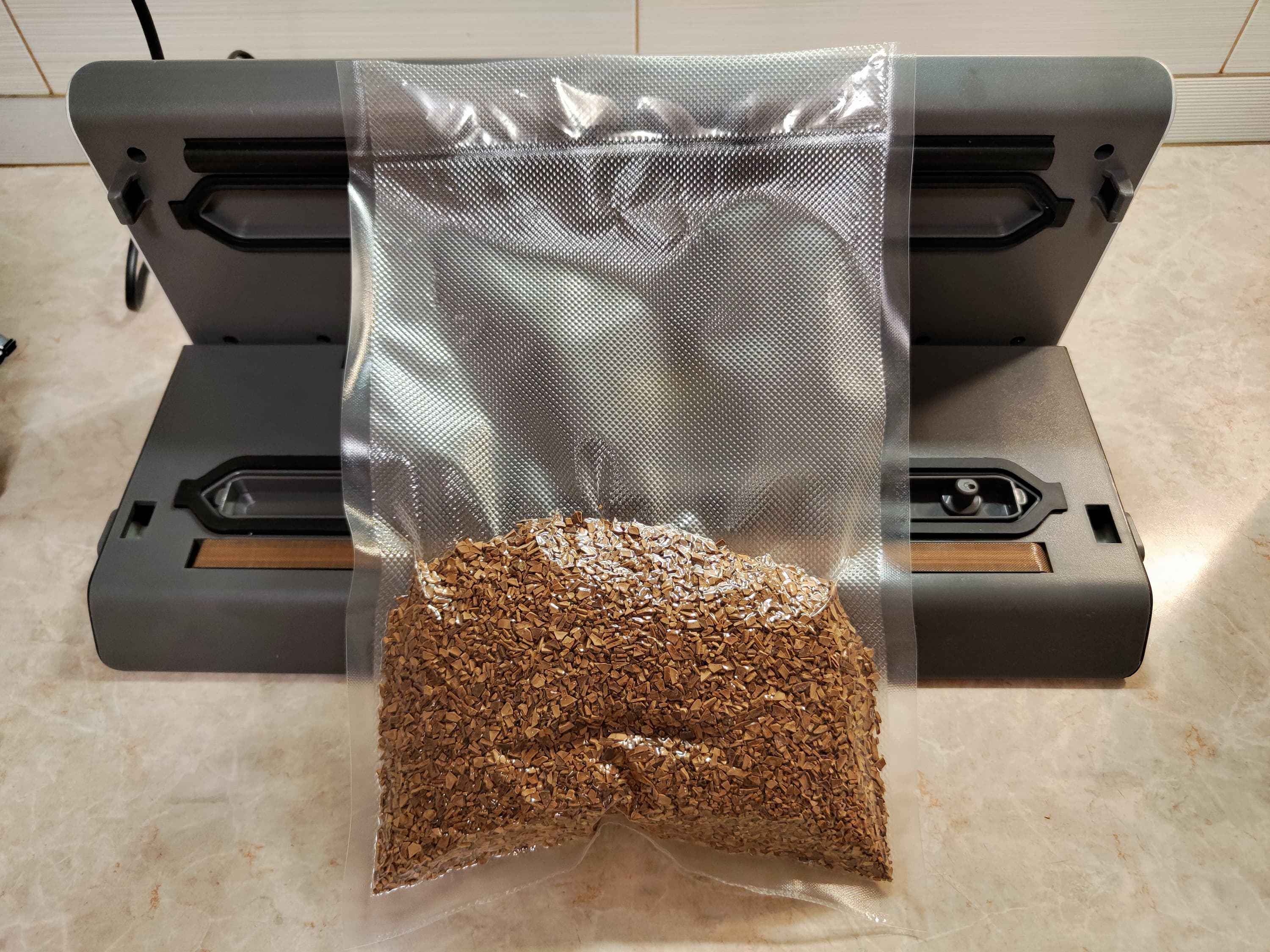 Ну, и совсем последний тест с кофе — не пропадать же оставшемуся маленькому пакету: уложим в него максимум возможного объема кофе так, чтобы можно было еле-еле закрыть крышку. Мы с большим трудом разместили края пакета под ограничителями (они в таких случаях незаменимы), аккуратно закрыли крышку вакууматора буквально в нескольких миллиметрах от края продукта и запустили процесс упаковки.