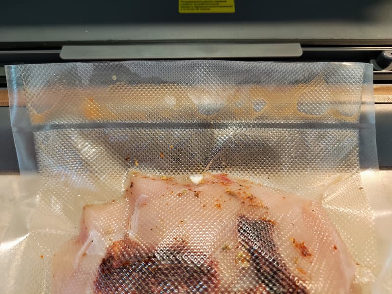Мы извлекли пакет, очистили съемную емкость вакуумной камеры, слегка протерли бумажной салфеткой края пакета и повторили эксперимент. В этот раз мы принудительно остановили вакуумирование и воспользовались функцией запайки. И еще раз на всякий случай чуть выше, чтобы уж наверняка. Оба шва получились ровные, без заломов и непропаянных участков. При этом воздуха внутри пакета почти нет, продукт обжат достаточно плотно.