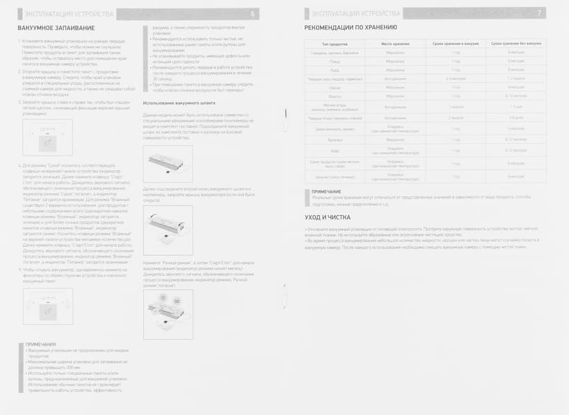 Руководство по эксплуатации напечатано в форме шестистраничной брошюры формата А5. Текст знакомит пользователя с устройством прибора, наименованием его частей, правилами эксплуатации и управления, а также способами работы с вакууматором. Некоторый интерес представляет сравнительная табличка со сроками хранения различных продуктов при вакууме и без него.