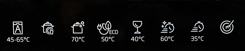 В левой части здесь мы видим сенсорные кнопки включения и выбора программ. Чуть правее — инструменты управления дополнительными режимами стирки, а рядом с ними — светодиодный дисплей, на котором отображаются время выполнения цикла с выбранными опциями и возможные сообщения об ошибках. Две кнопки справа отвечают за отложенный старт и позволяют запустить или приостановить мытье посуды.