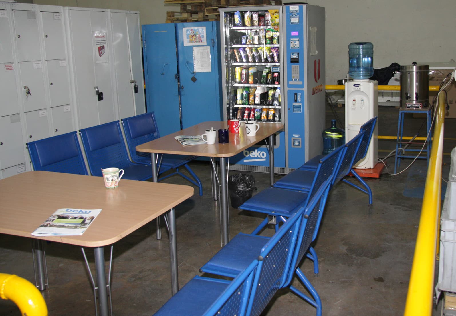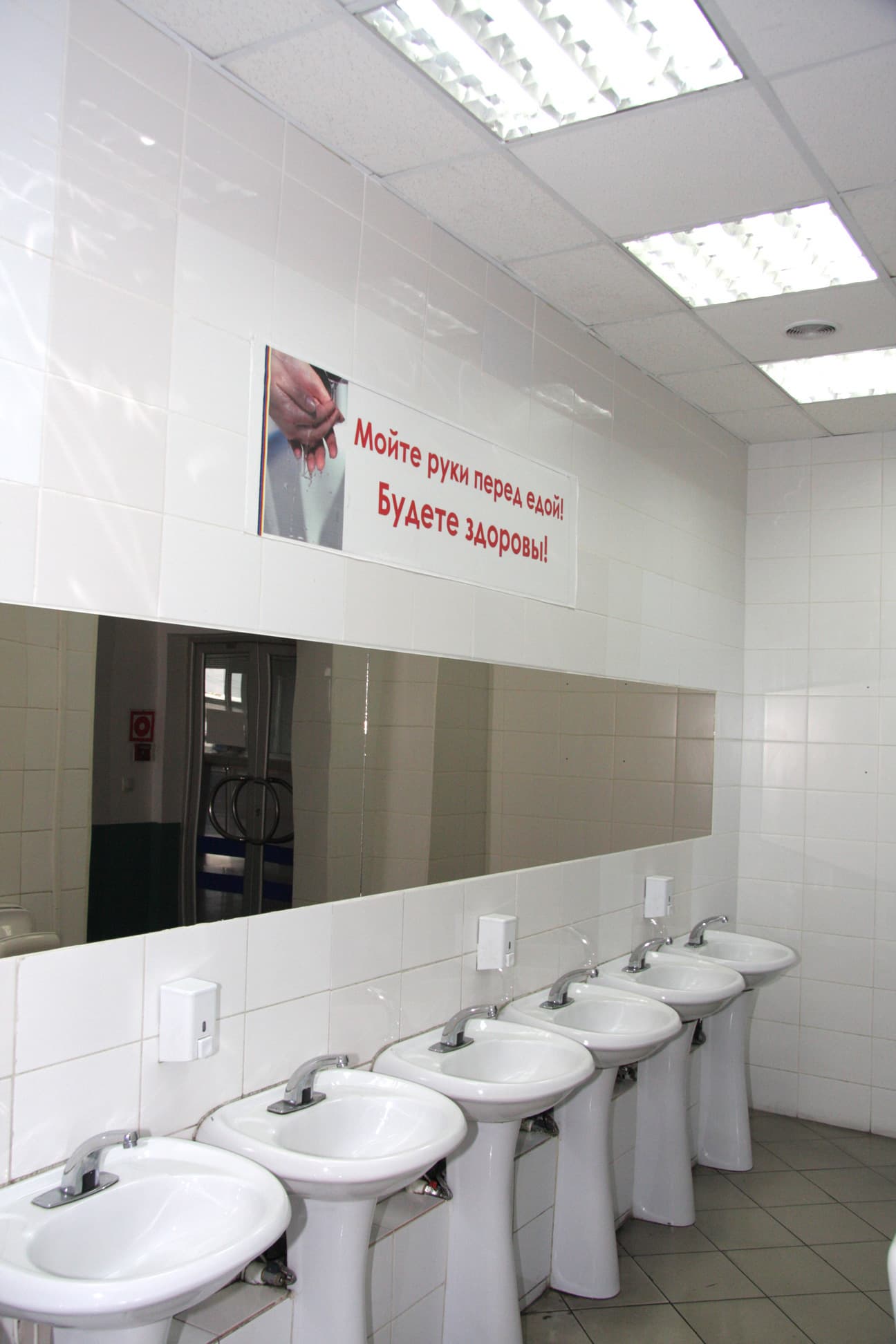 Отметим, что надписи на стендах, табличках и т. д., разумеется, на русском языке, но что-то продублировано на английском и турецком. Недалеко — вход в столовую, напротив — отдел кадров, чуть подальше сгруппированы терминалы и банкоматы Сбербанка, есть пара автоматов с закуской и напитками и все это разбавлено стендами с информационно-агитационным содержанием. Тут же работники могут полистать каталог с продукцией и заказать что-то из него. Мы явно попали в самый центр жизни завода.
