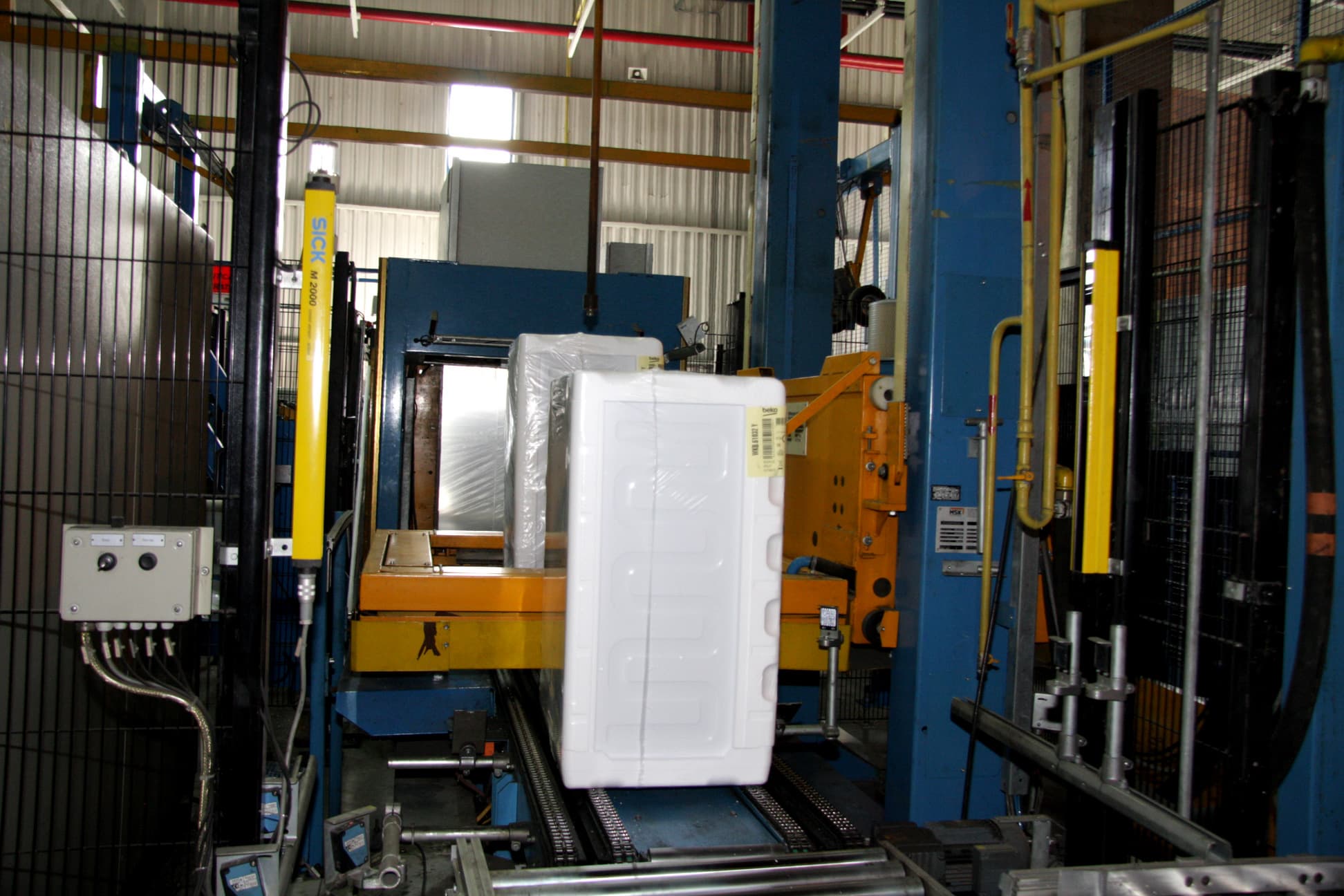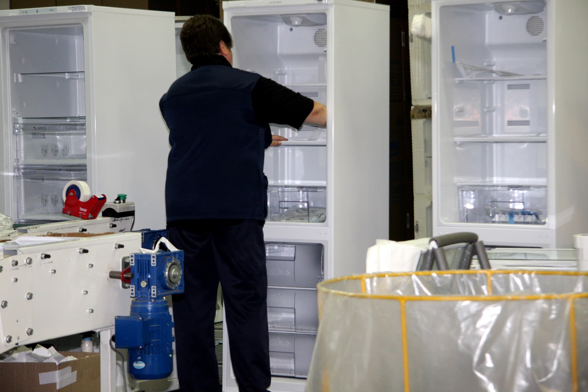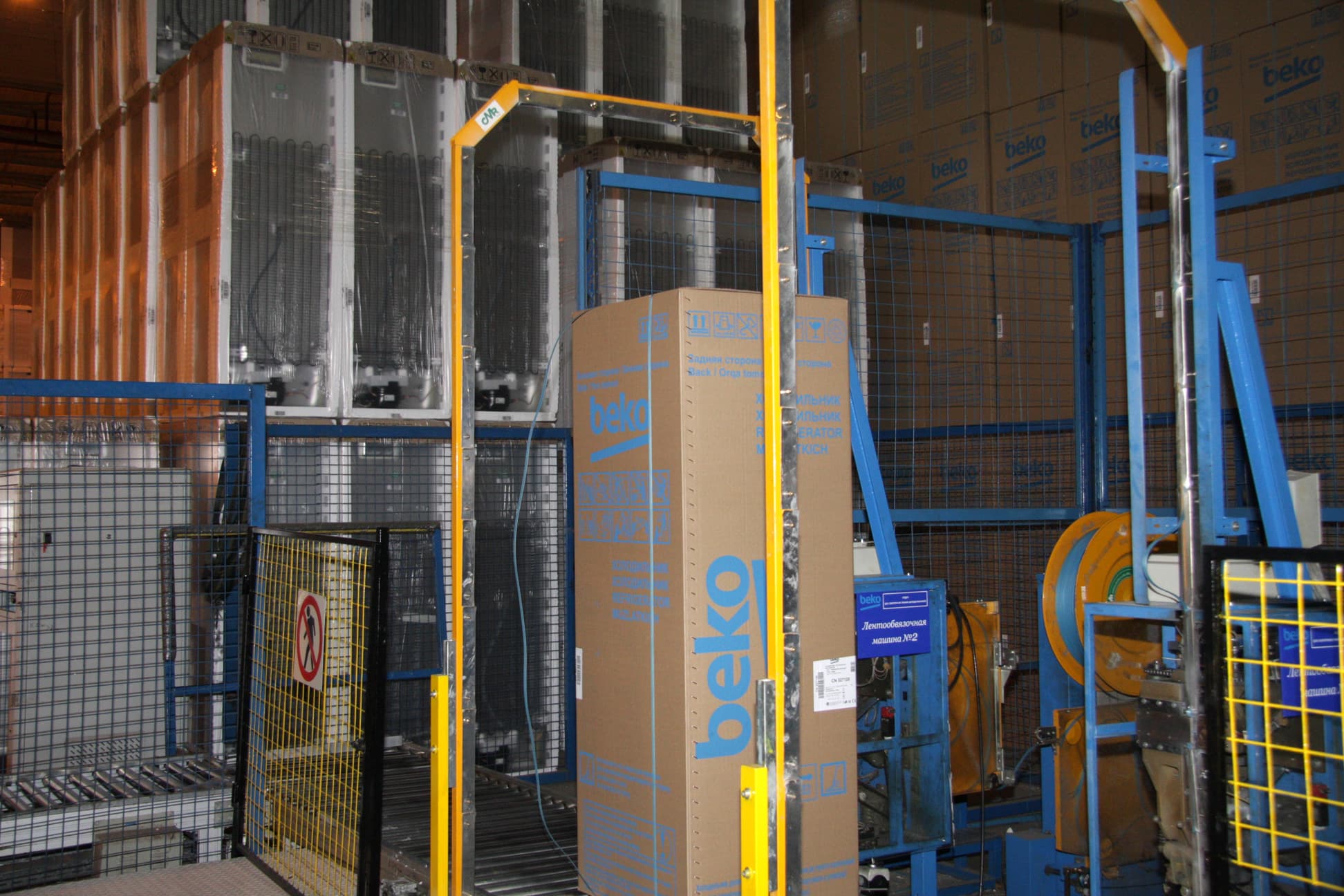 Затем лифтом готовый холодильник переправляется на участок упаковки. Тут вариантов два: или утяжка в пленку, или картонная коробка, стянутая пластиковыми лентами.