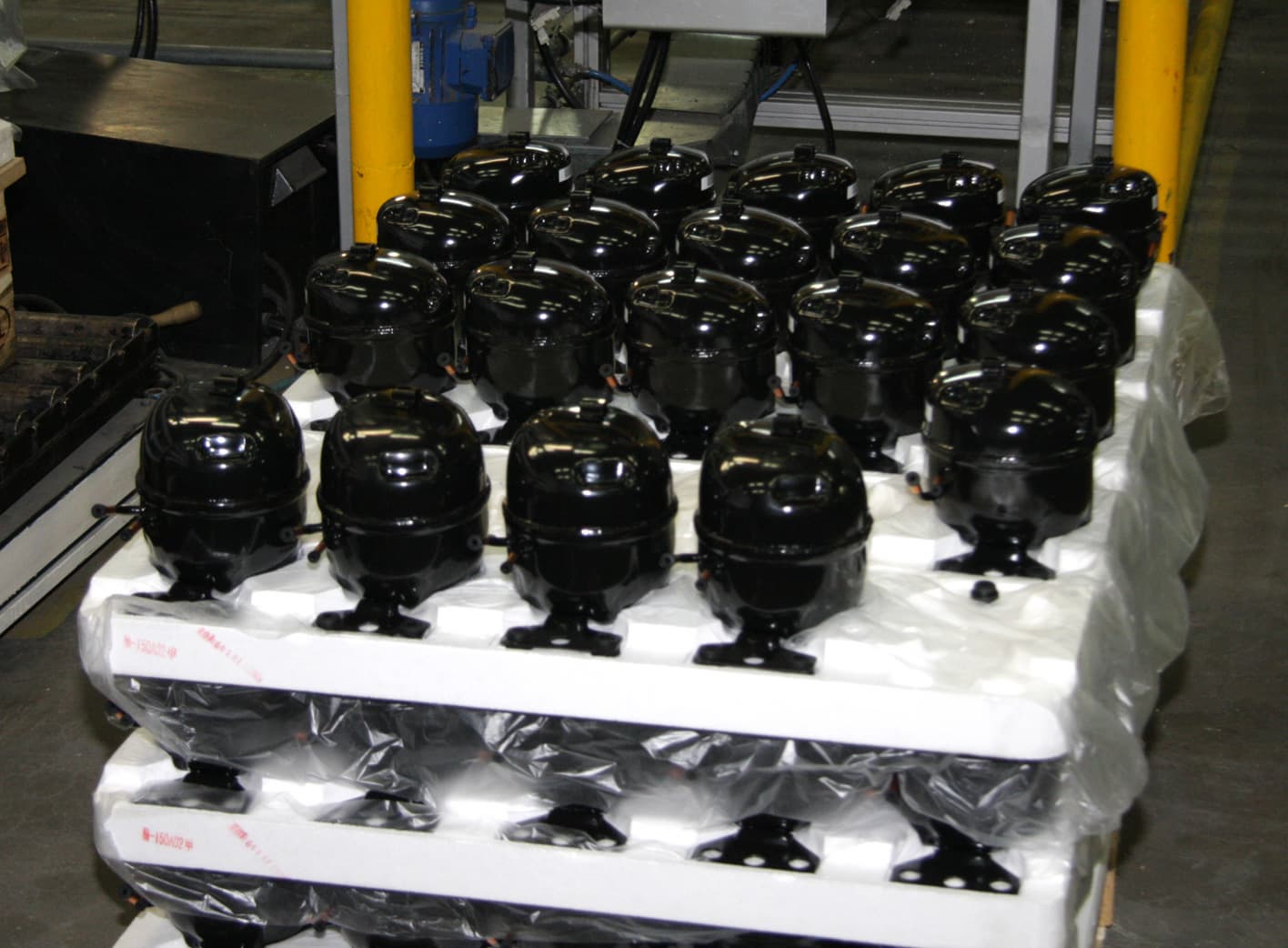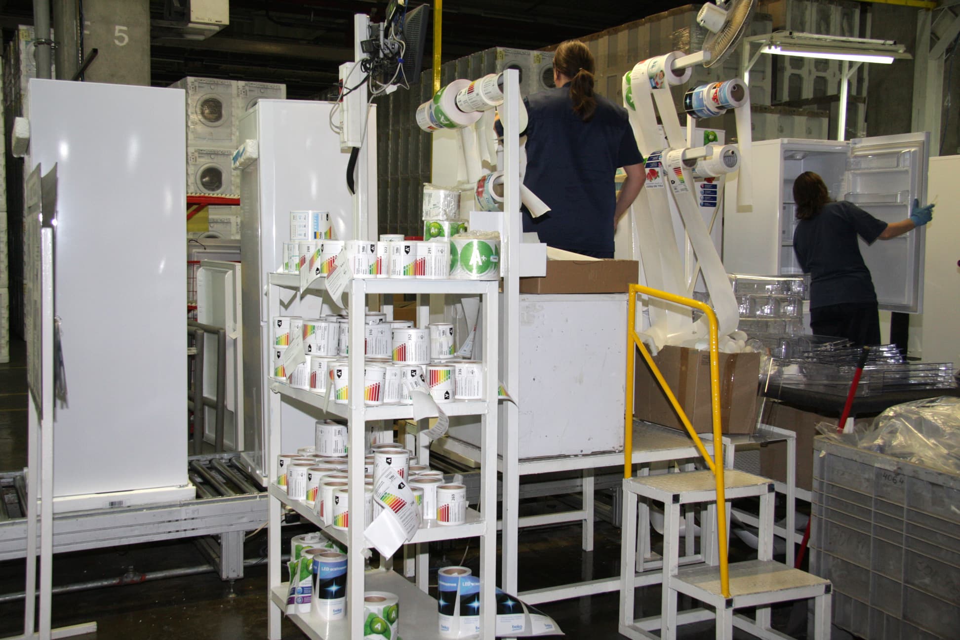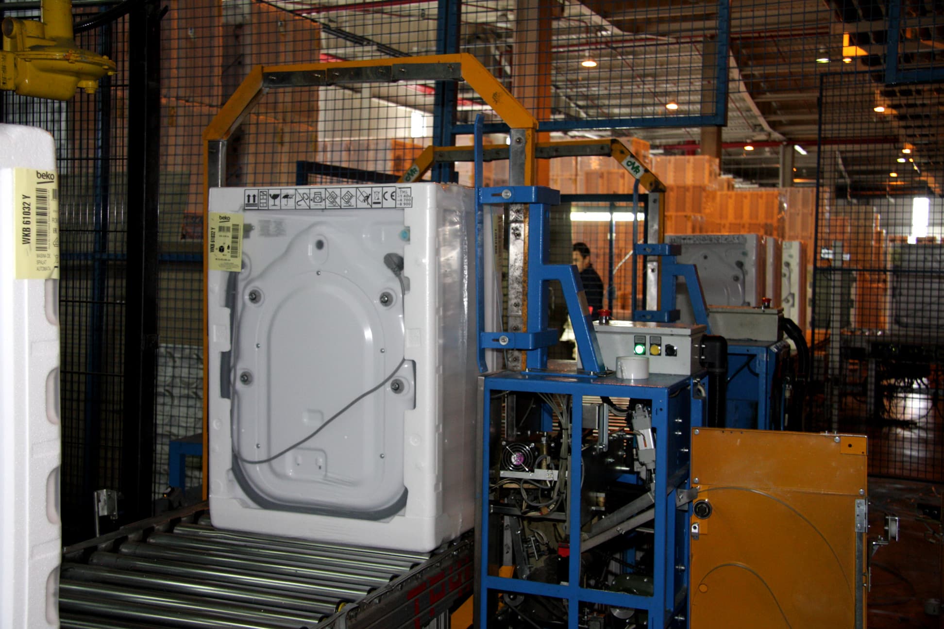 Затем лифтом готовый холодильник переправляется на участок упаковки. Тут вариантов два: или утяжка в пленку, или картонная коробка, стянутая пластиковыми лентами.