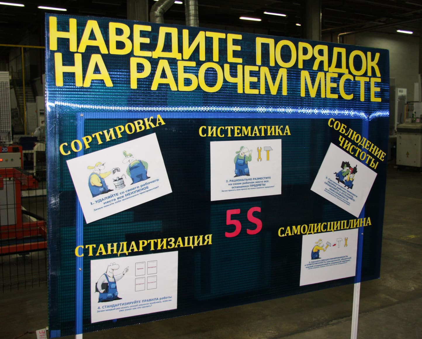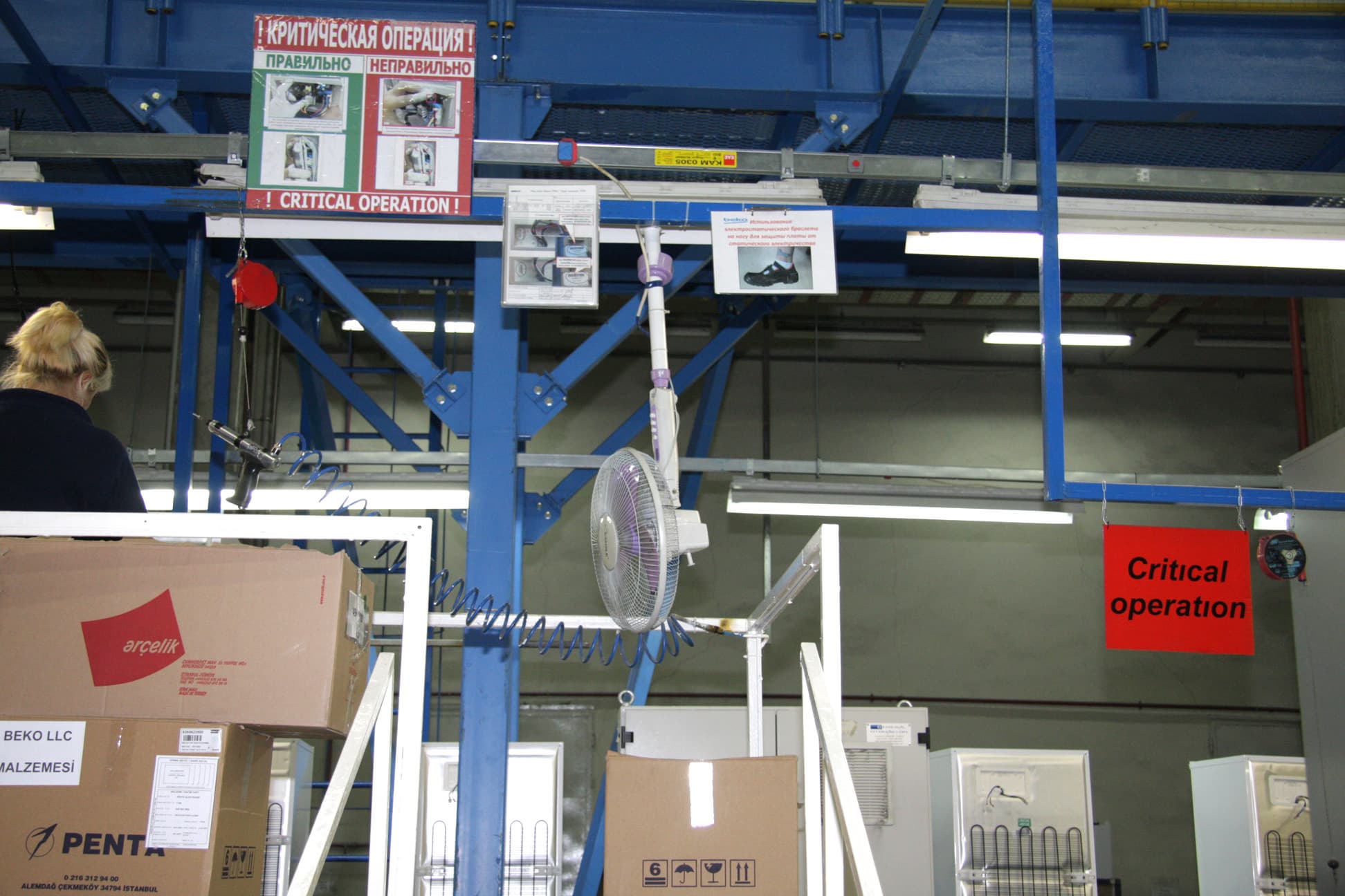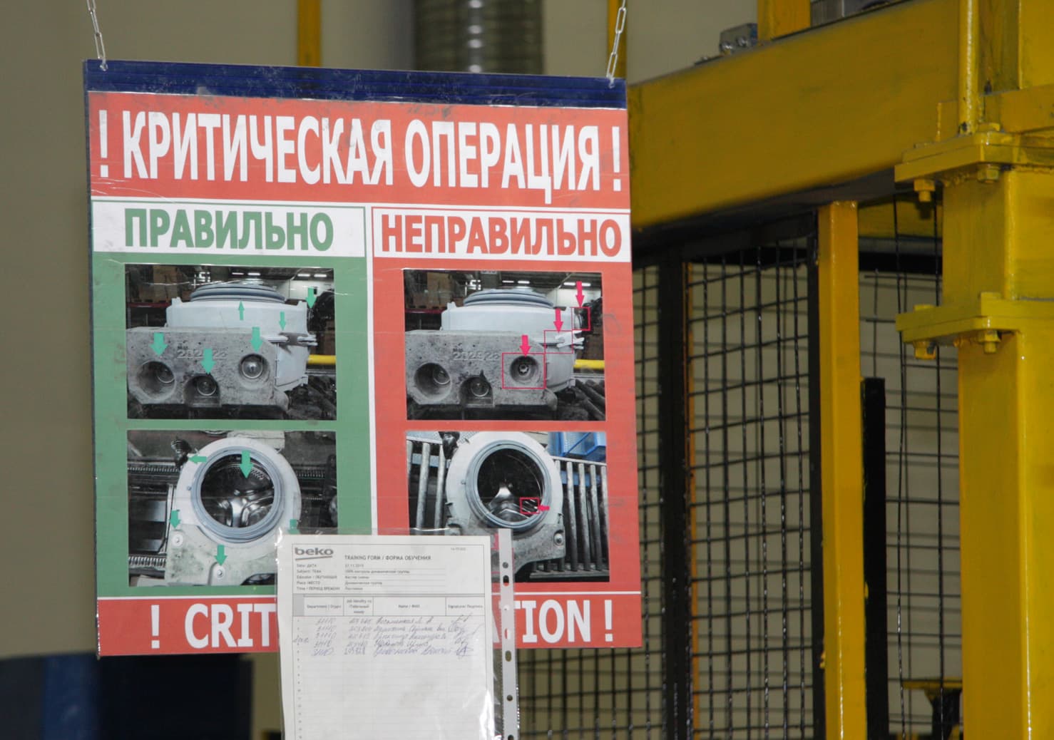 Вдоль конвейерных линий размещены многочисленные стенды и мониторы, подсказывающие работнику, что нужно делать. Критические для результата участки отмечены специальными табличками, а в ряде случаев наглядно разъясняется, как делать нужно, а как не нужно.