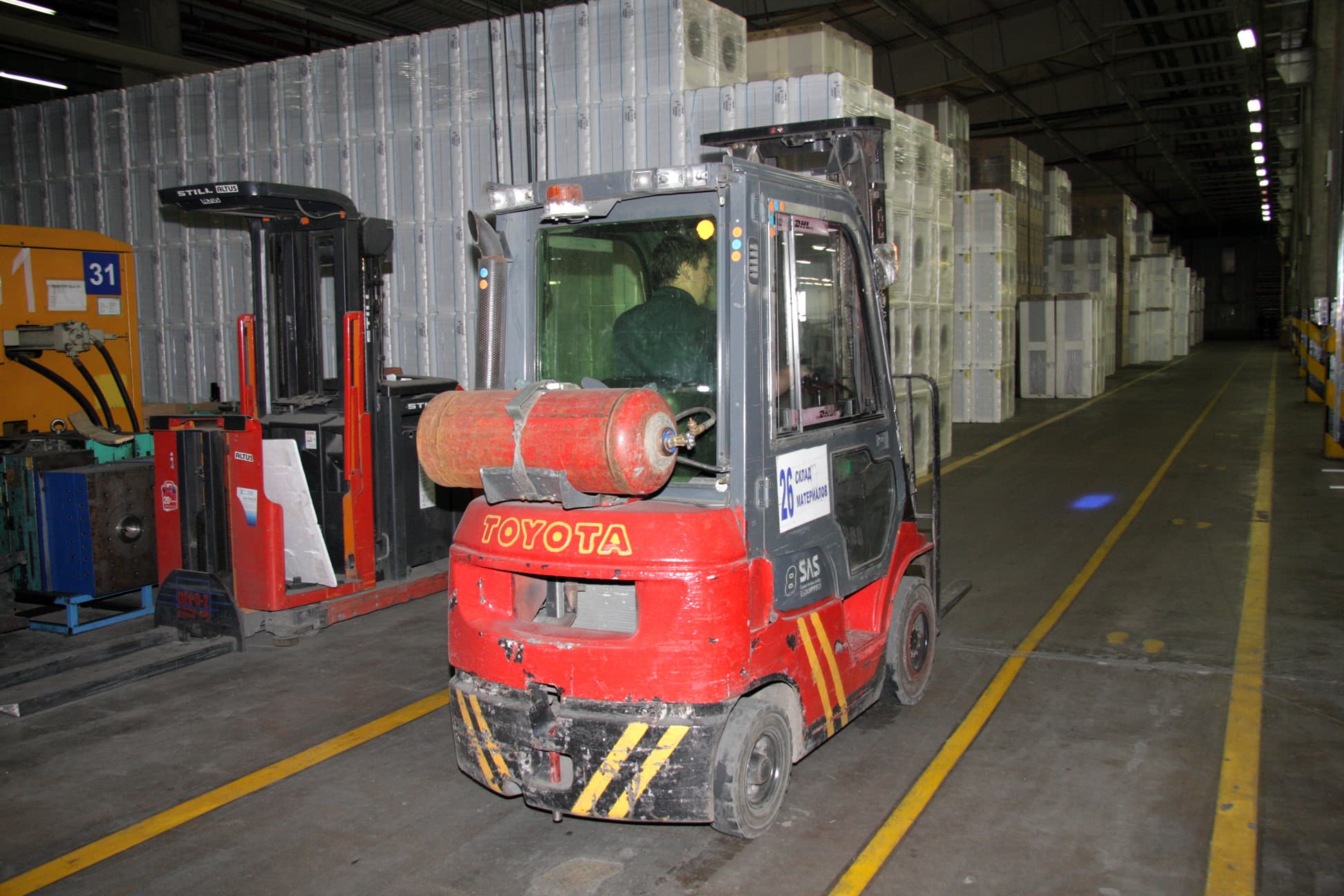 Большое внимание уделяется безопасности. На полу размечены зоны для движения погрузчиков и пешеходов, сами погрузчики оснащены предупреждающим фонарем синего цвета, проецирующим метку на полу перед этим транспортным средством. Таким образом идущие впереди пешеходы предупреждаются о приближающейся сзади опасности.
