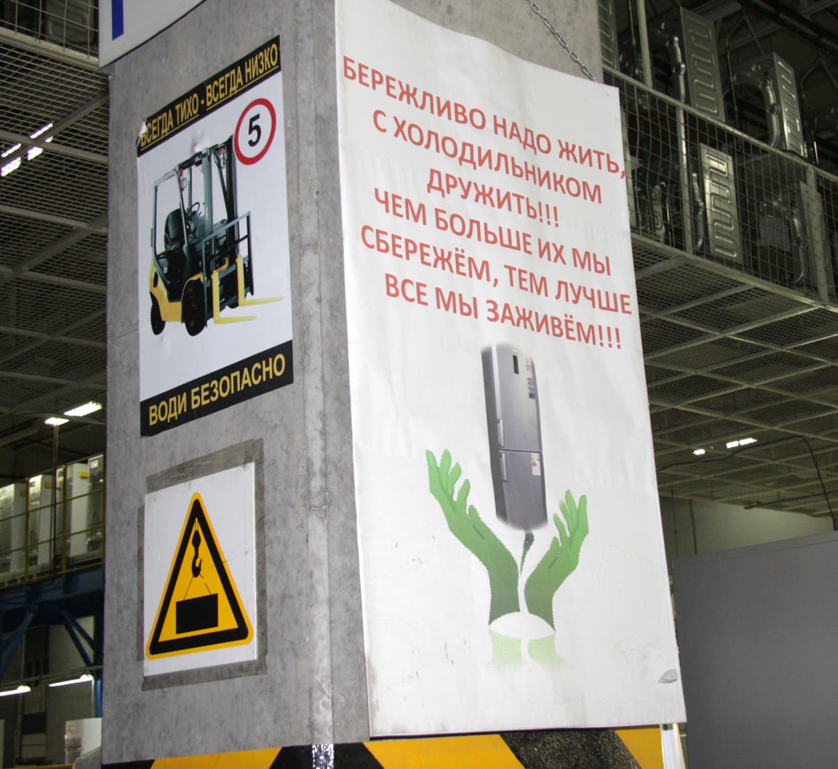 Борьба за повышение безопасности не прекращается, о чем свидетельствуют стенды, рассказывающие о внесенных изменениях на производственных линиях.