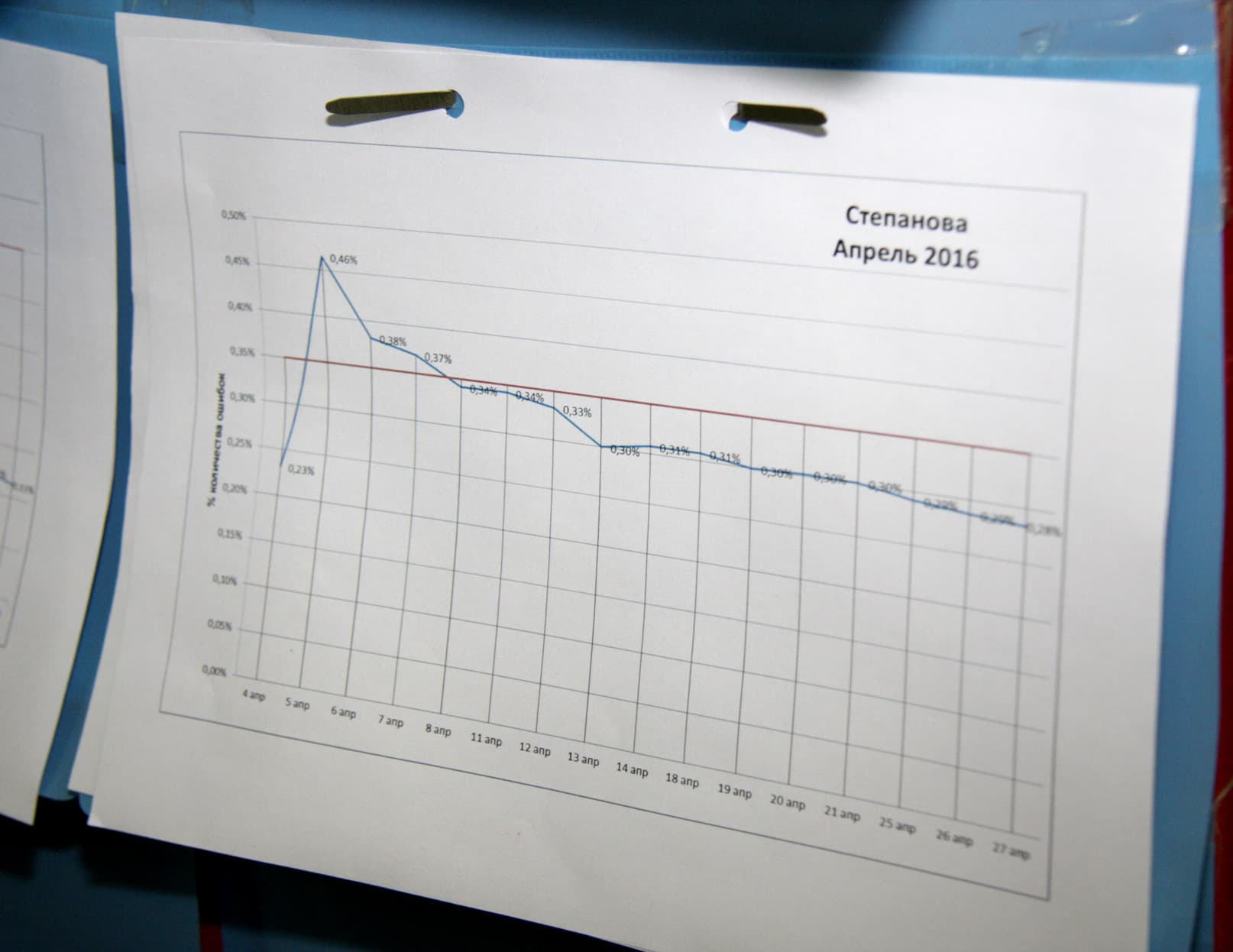 Статистика по дням по проценту допущенных ошибок размещена в открытом доступе на стендах. Там же статистика по случаям брака вообще и фотографии типичных неисправностей. Все это, видимо, должно повысить индивидуальную и коллективную ответственность в борьбе за повышение качества и снижения брака.
