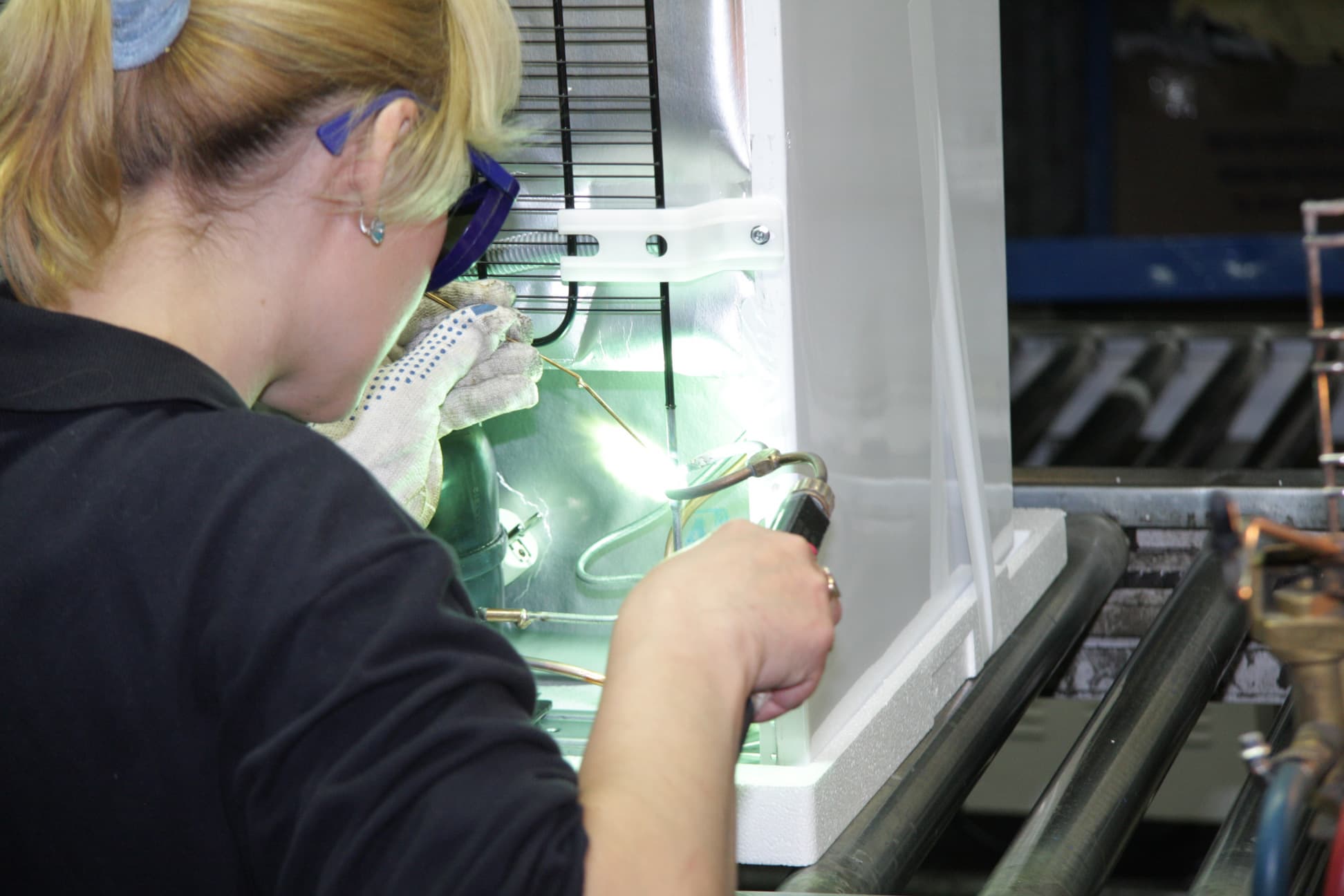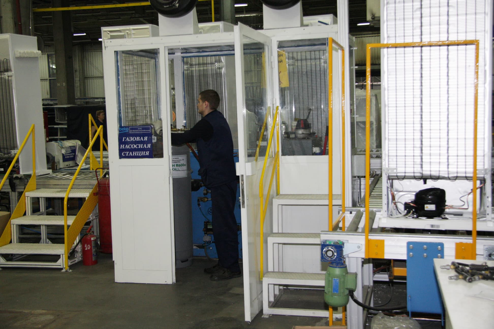 После этого контроль за давлением в системе выявляет отсутствие герметичности. В процессе этого холодильники движутся по карусели на тележках с вакуумными насосами.