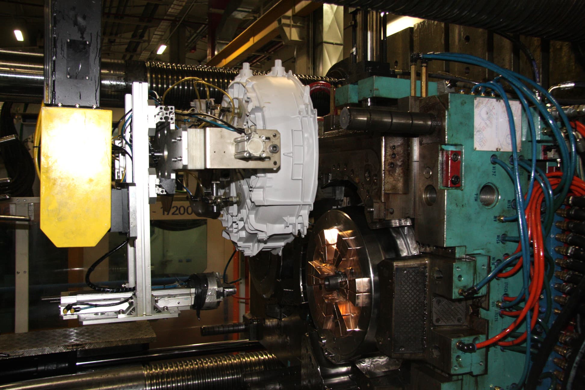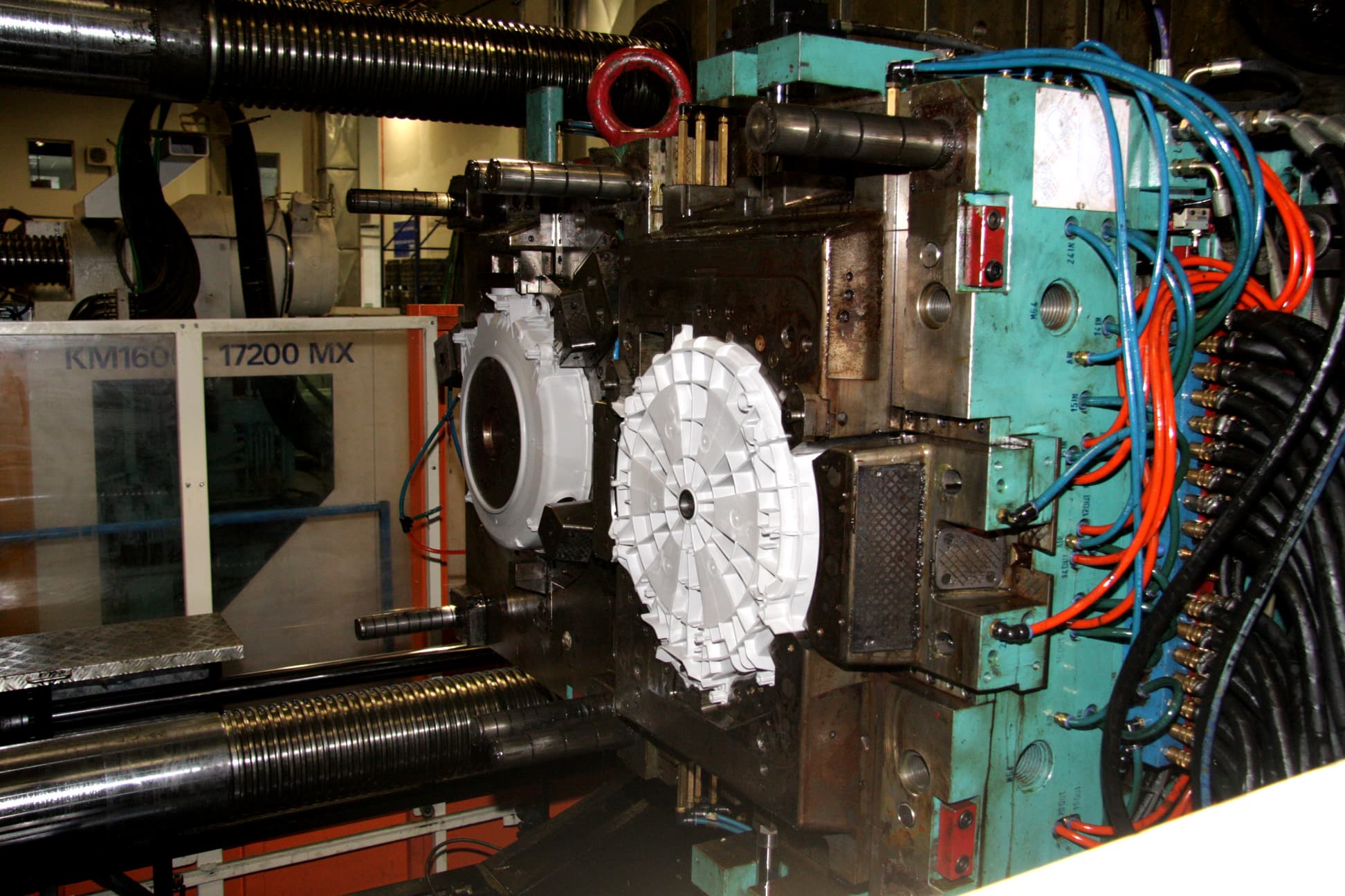 Разъехавшиеся половинки пресса с только что отлитыми половинками бачка стиральной машинки.