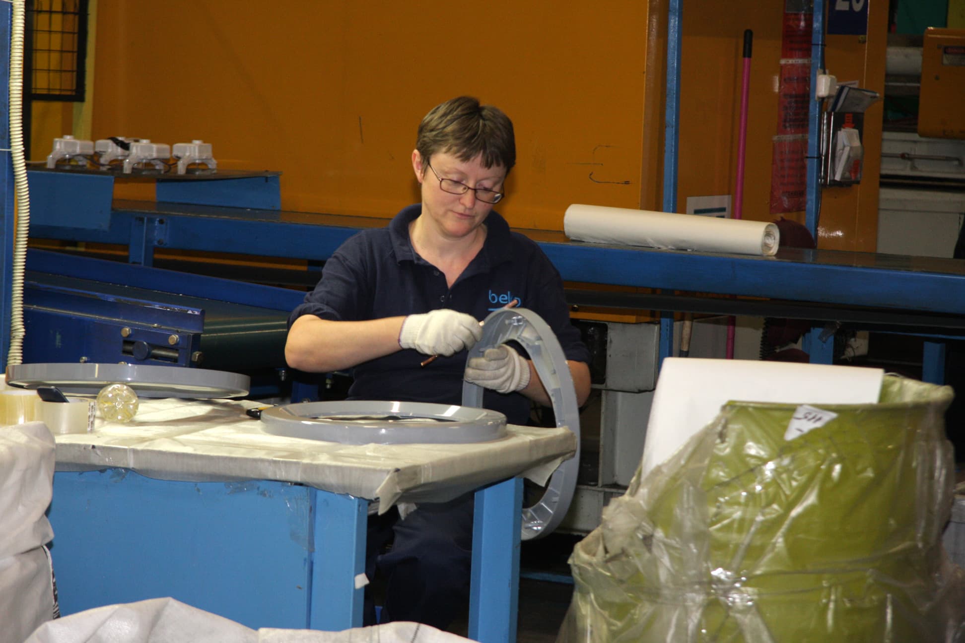 Начало сборочного конвейера. Барабан вкладывается в половинку бачка и накрывается второй.