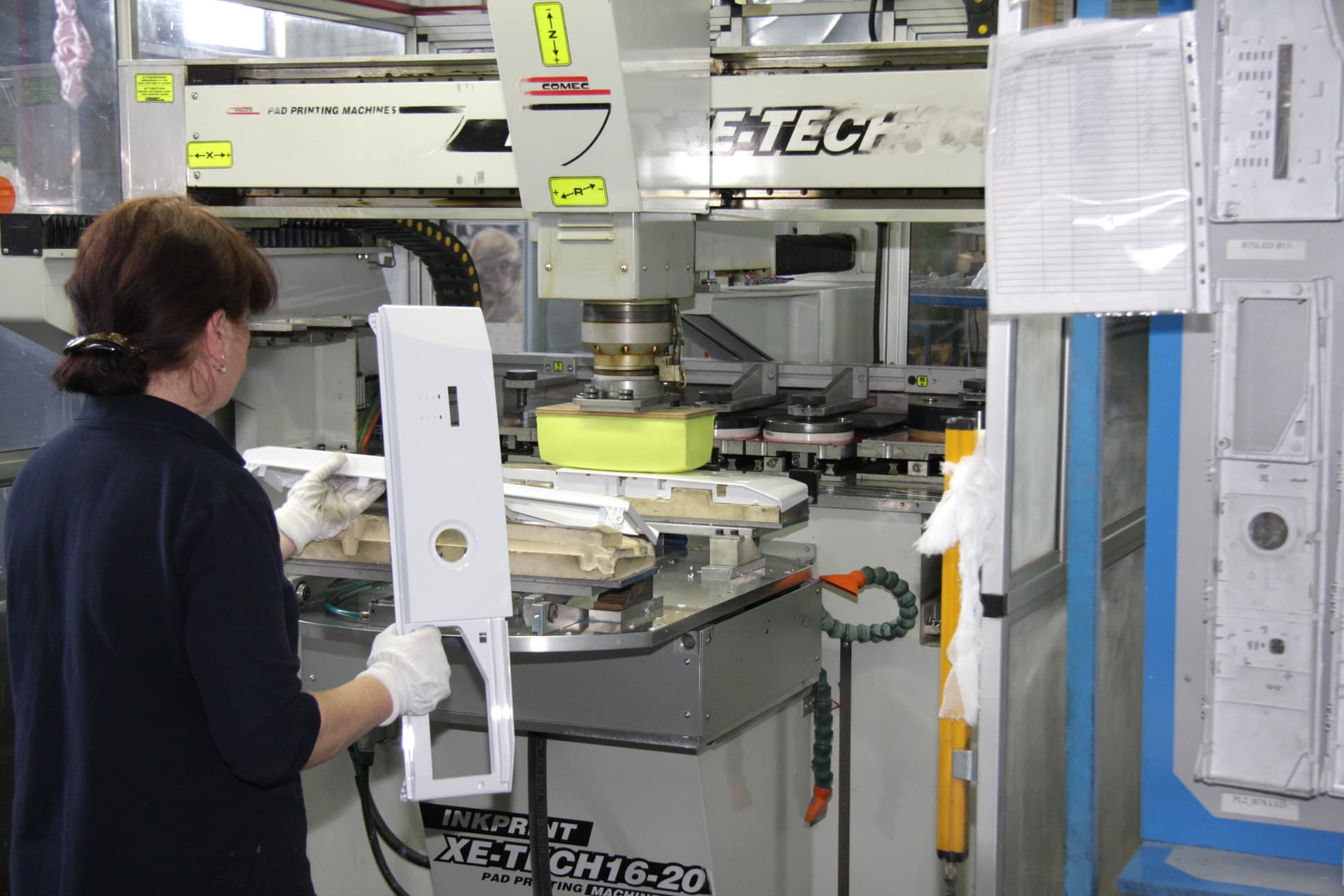 На прошедшие контроль при необходимости наносятся обозначения и декоративные элементы методом тампонной печати.